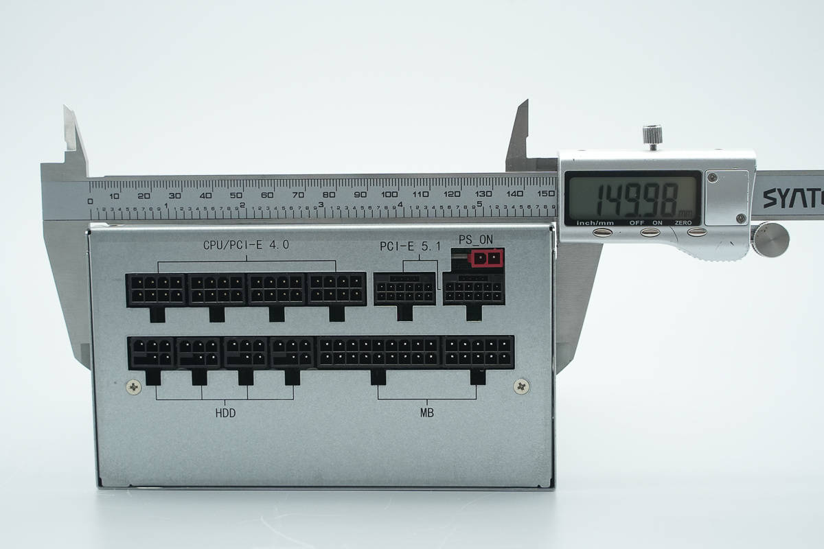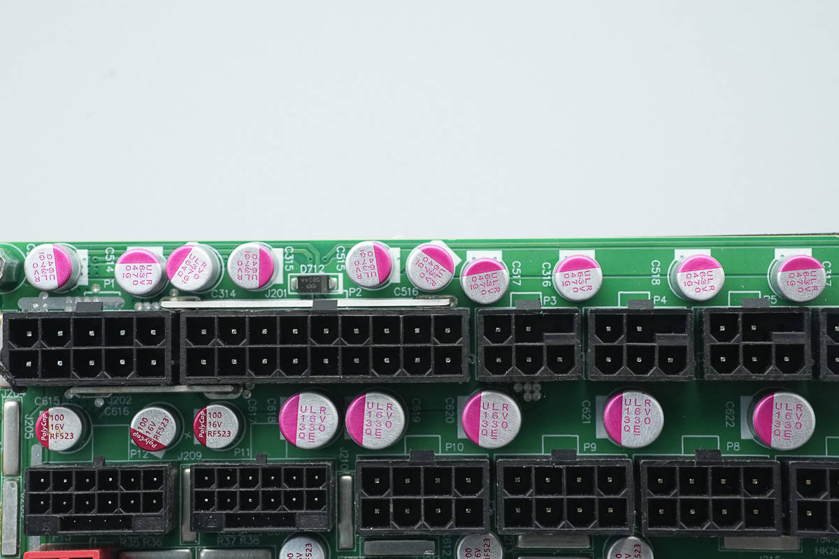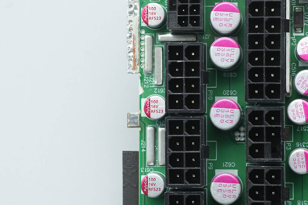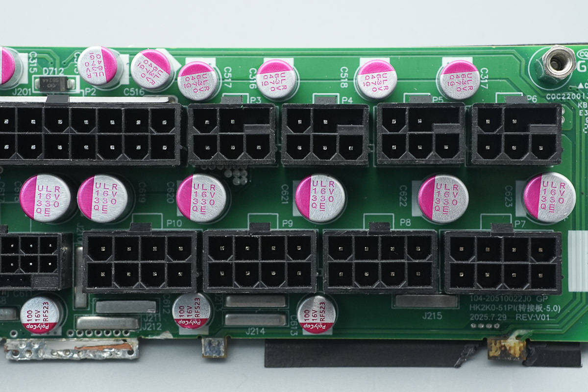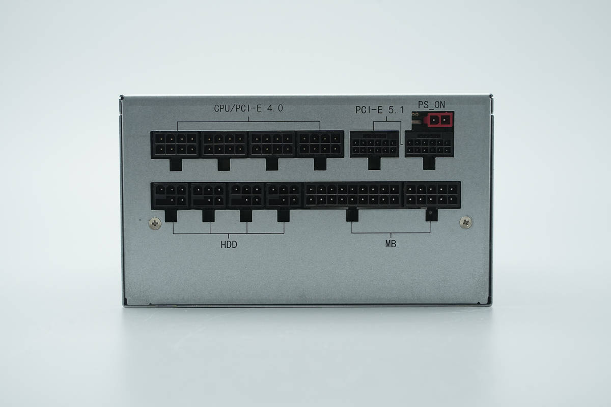 上方一排端子用于CPU和PCIe接口供电,右侧设有两个PCIe 5.1接口和PS_ON端子,PS_ON端子用于双电源同步,无需额外的并联器。下方一排端子左侧为硬盘供电,右侧为主板供电。