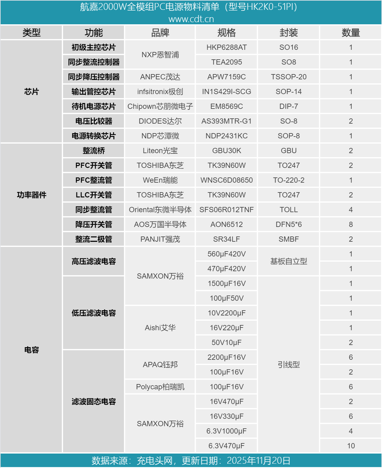 最后附上航嘉2000W全模组PC电源的核心物料清单,方便大家查阅。