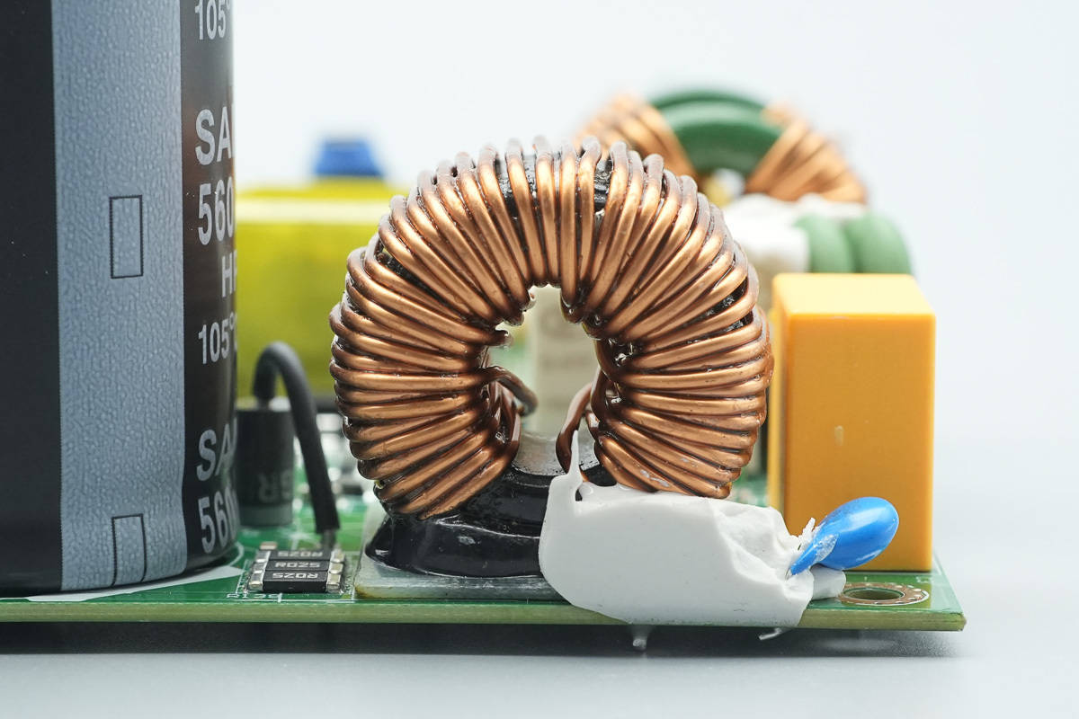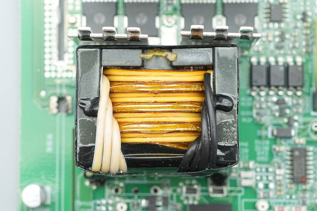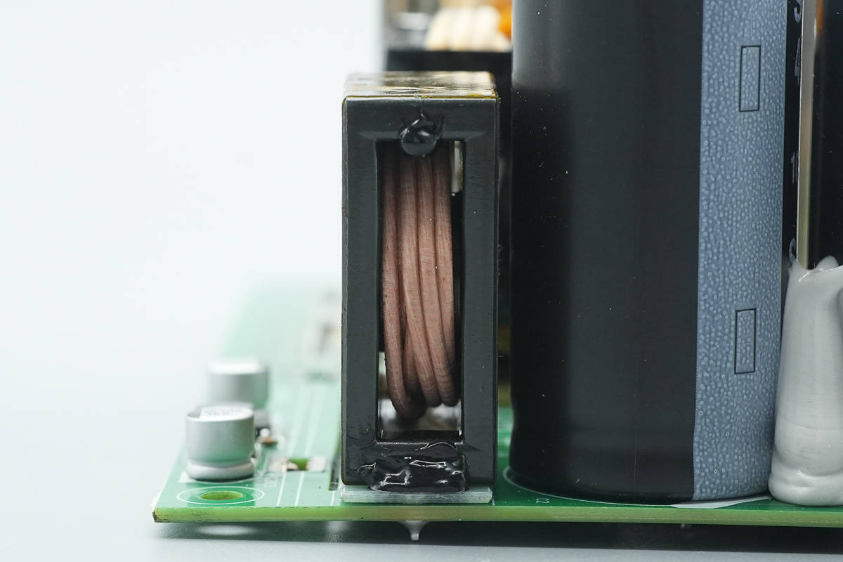 PFC升压电感采用漆包线绕制,底部设有电木板绝缘。