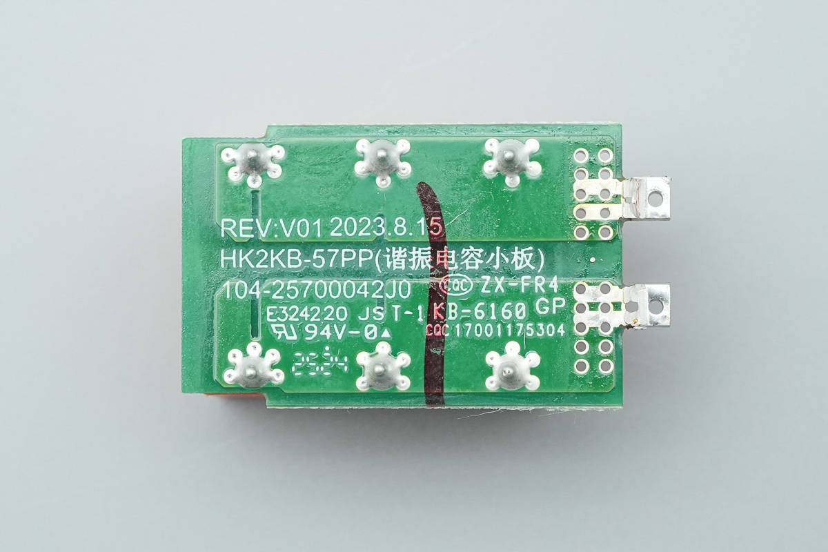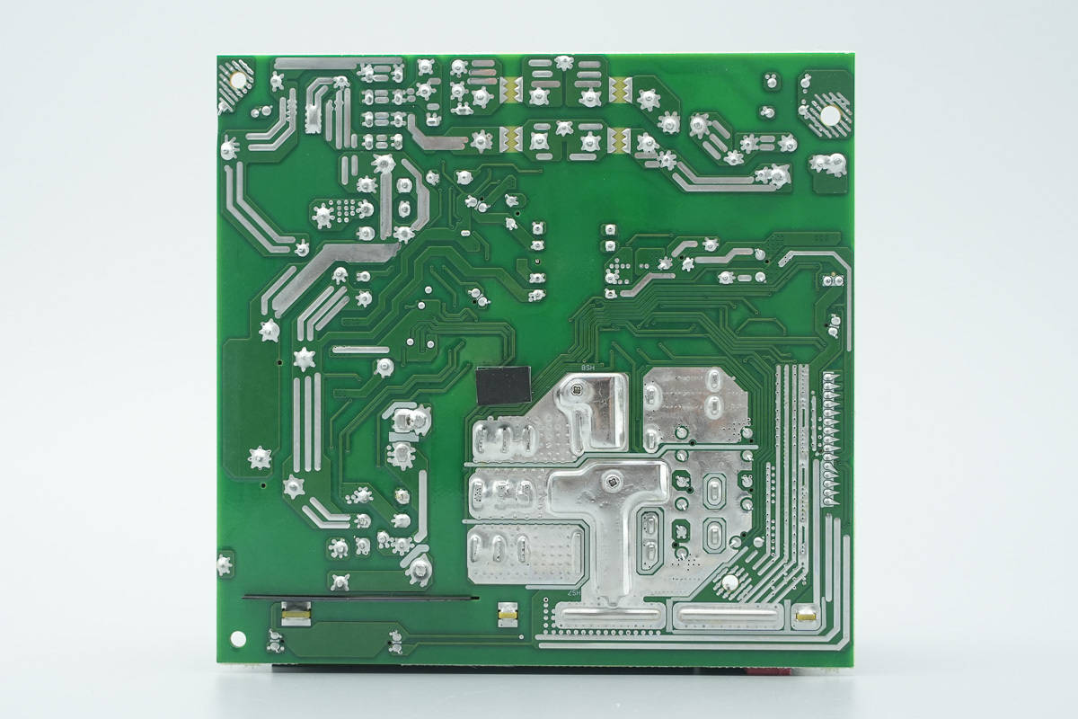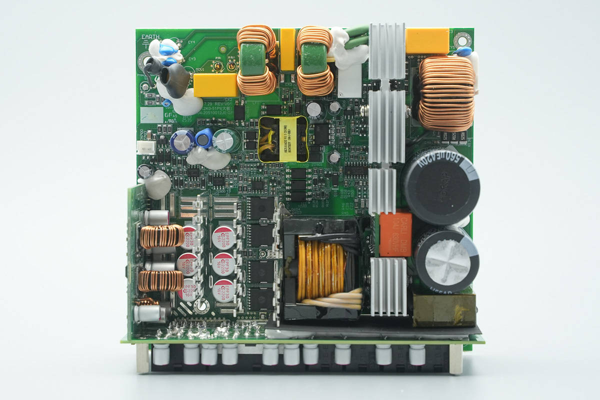 PCBA模块正面一览,在左上角为电源输入端,设有保险丝,压敏电阻,安规X2电容,共模电感,NTC热敏电阻和继电器,右侧设有薄膜滤波电容和PFC升压电感。下方设有两颗高压滤波电容和谐振电感。