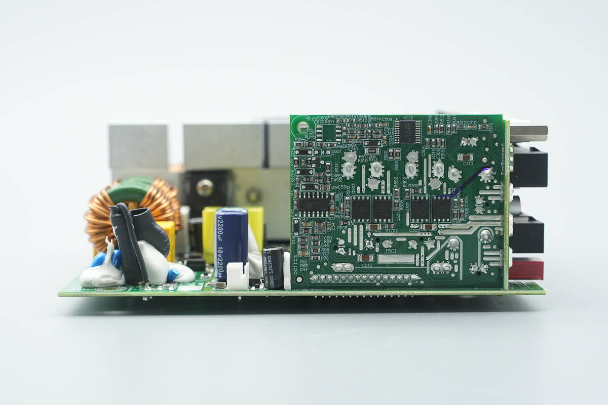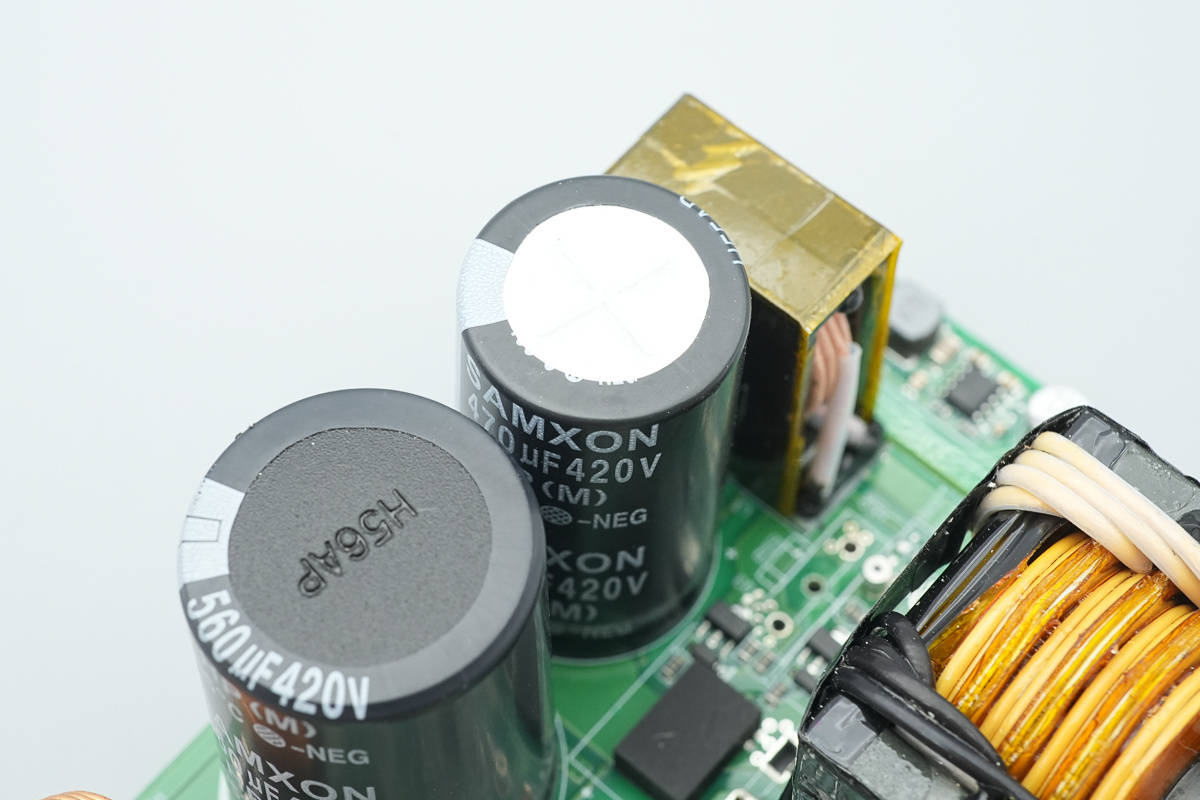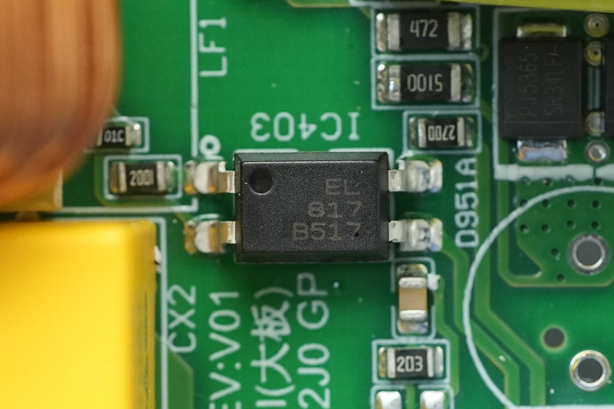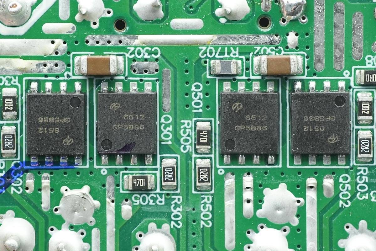 同步整流控制器采用恩智浦TEA2095,搭配使用东微『半导体』SFS06R012TNF同步整流管。同步降压控制器采用茂达APW7159C,搭配使用万国『半导体』AON6512用于3.3V和5V输出。电源高压电容来自万裕,并采用固态电容进行输出滤波,整体用料扎实,结构设计到位。