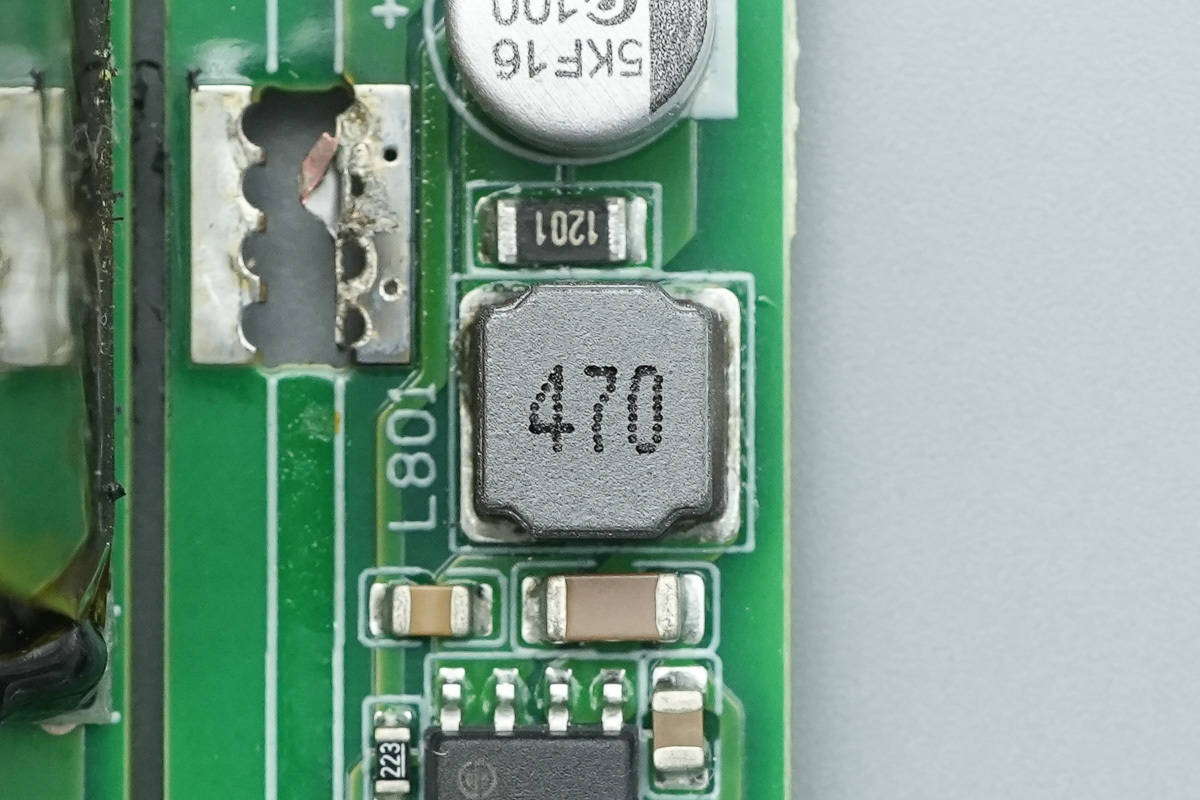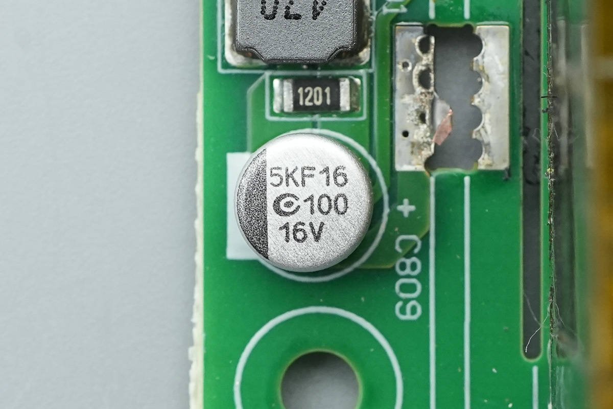 两颗输入滤波电容来自万裕,为ULR系列导电聚合物固态电容,规格为16V470μF。