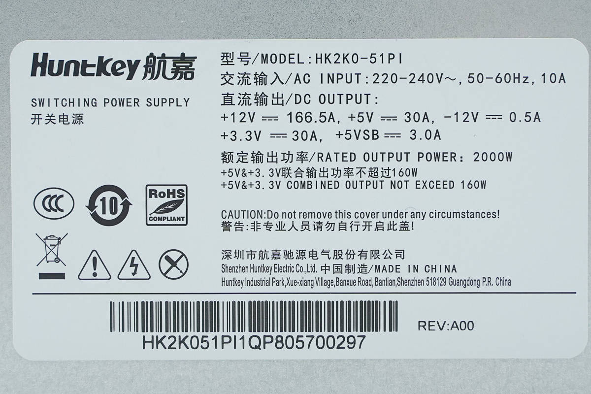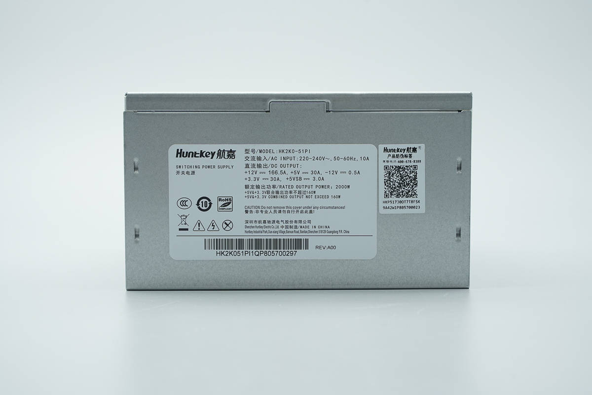 航嘉这款全模组PC电源采用镀锌钢板外壳,型号为HK2K0-51PI,为标准ATX尺寸,支持220~240V输入电压,主路输出电压为12V,输出电流为166.5A,5V和3.3V输出电流均为30A。电源为全模组设计,提供两个PCIe5.1接口,支持两张RTX4090,双路CPU及充足的SATA接口,支持2-4路显卡的GPU『服务器』和多硬盘供电需求。