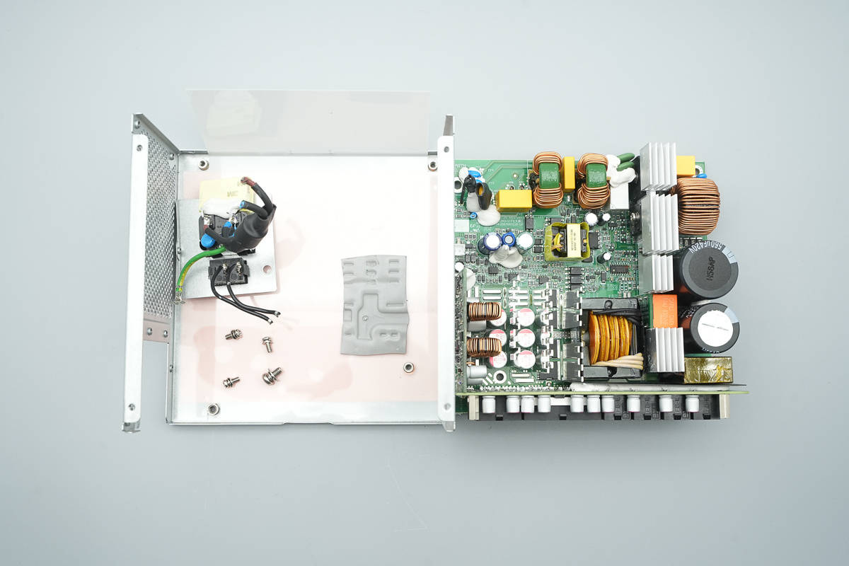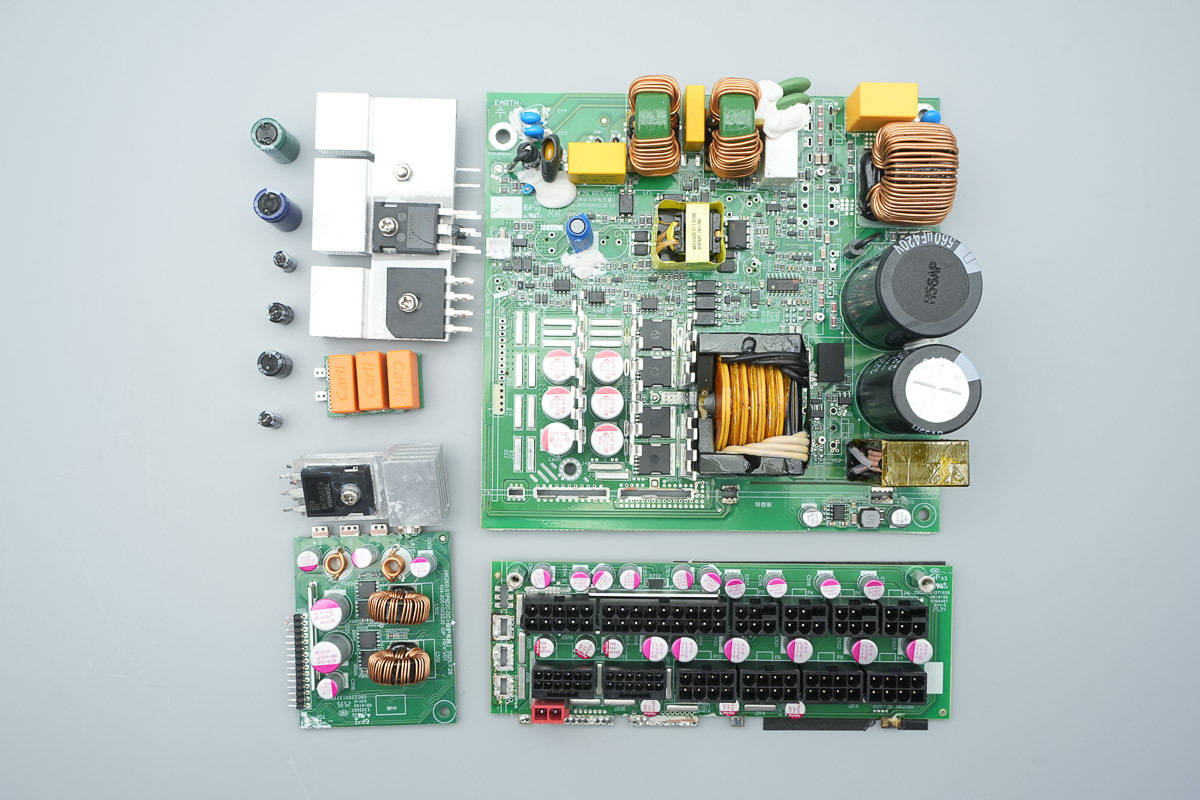 焊接拆下整流桥,开关管,谐振电容,降压小板和输出模组小板,继续进行拆解。