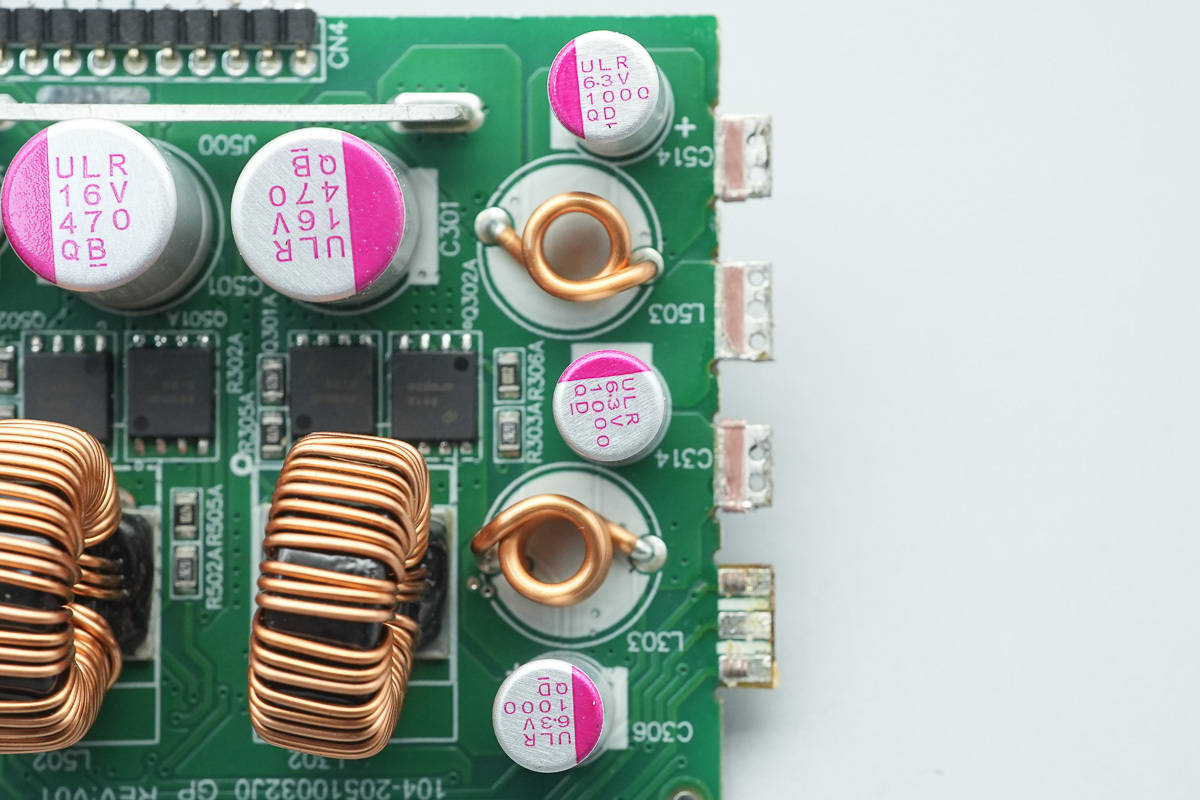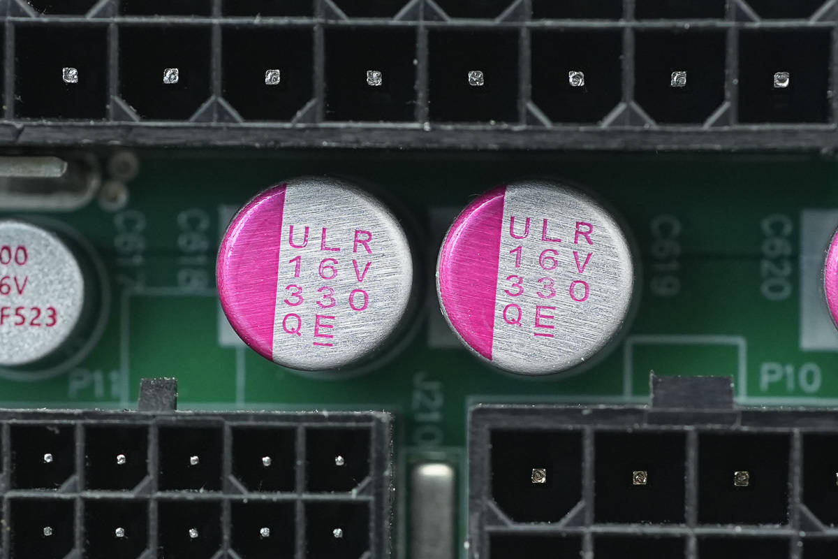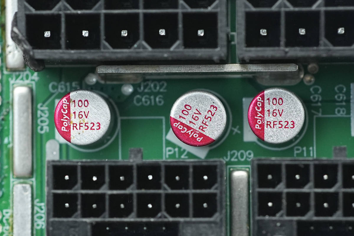 滤波固态电容来自钰邦,为AREP系列导电高分子固态电容,寿命长,纹波小,适用于电源产品,规格为2200μF16V,使用六颗并联。