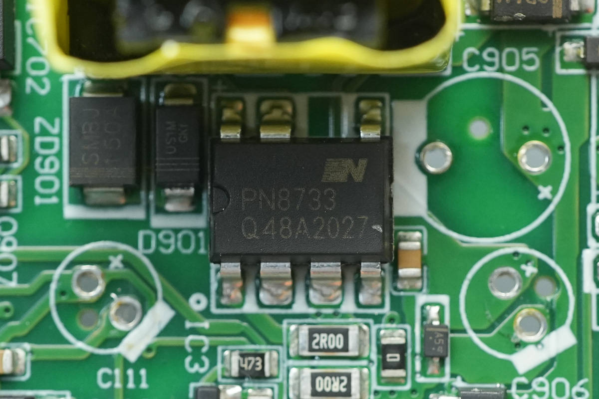 待机电源『芯片』来自芯朋微,型号PN8733,『芯片』内部集成控制器和800V耐压开关管,具备完善的保护功能,采用DIP7封装。