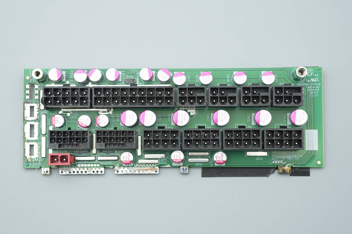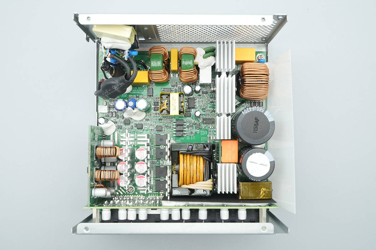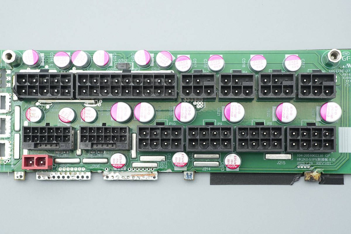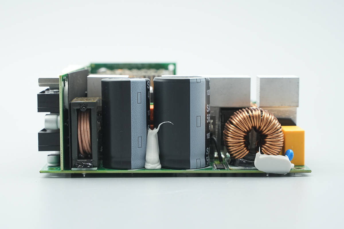 长条散热片为整流桥,PFC开关管和PFC整流管散热,下方设有谐振电容小板,小板下方散热片为LLC开关管散热。下方中间位置为LLC变压器,上方设有待机电源『芯片』和待机电源变压器。左侧设有同步整流管,滤波固态电容,同步降压小板和输出模组小板。