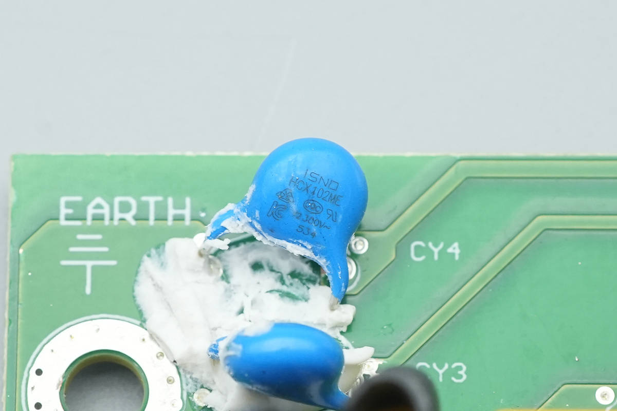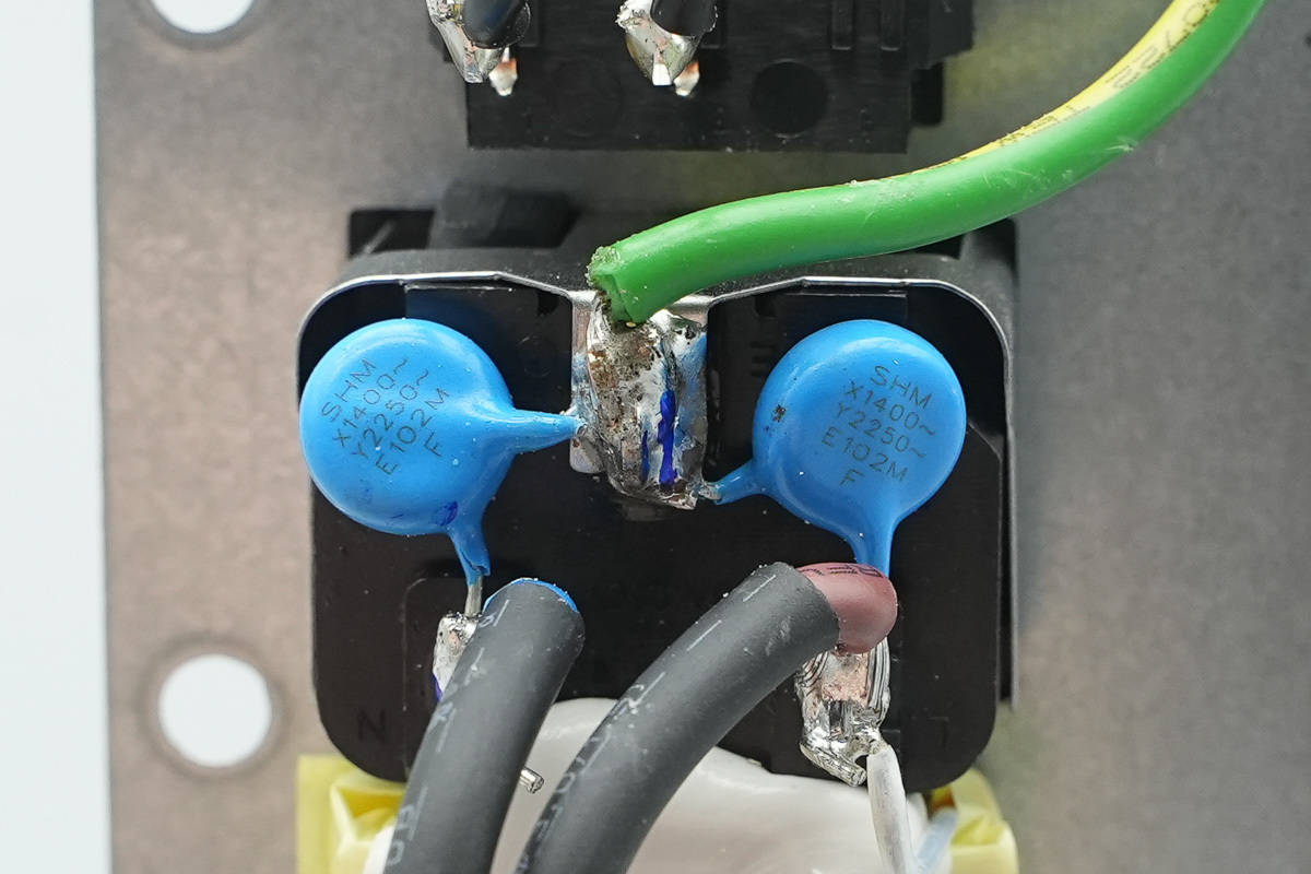 电源插座焊接两颗蓝色Y电容,来自南方宏明。
