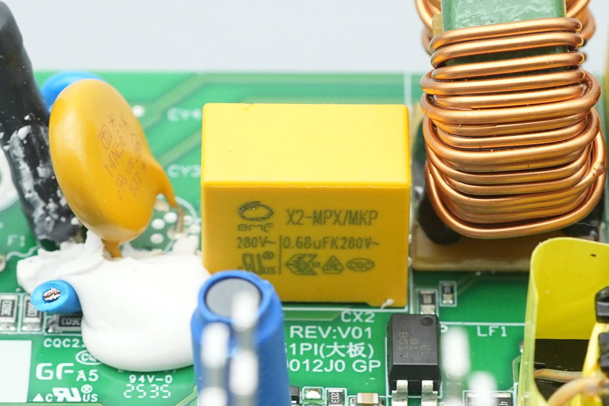 电源输入端设有保险丝,压敏电阻,两级共模电感和安规X2电容,NTC热敏电阻,继电器,整流桥和薄膜滤波电容。