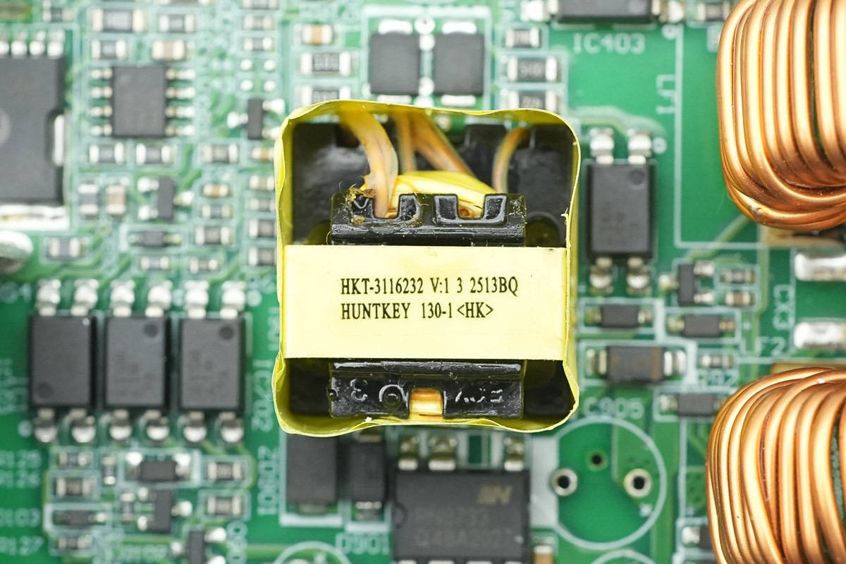 充电头网通过拆解了解到,航嘉这款电源采用主动式PFC+半桥LLC+SR+DC-DC架构,内部采用恩智浦HKP6288AT主控『芯片』,『芯片』为可编程设计,具备突发模式,低功率模式,CCM/DCM等多种模式,用于PFC和LLC控制。PFC开关管和LLC开关管采用东芝TK39N60W,PFC整流管使用瑞能WNSC6D08650碳化硅二极管。