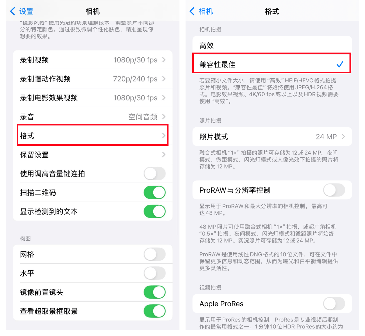 1. 修改拍摄格式: 打开iPhone的“设置” -> “相机📷️” -> “格式”。将默认的“高效”(HEIC)修改为“兼容性最佳”(JPG)。