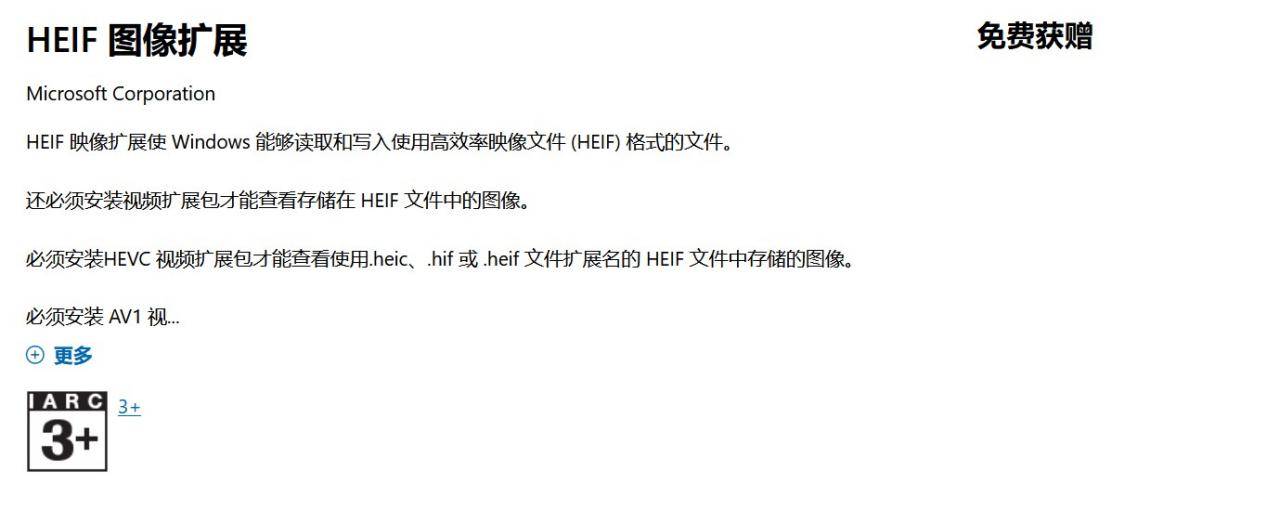 2.搜索并安装: 在商店的搜索框中输入 “HEIF 图像扩展” (HEIF Image Extensions),找到那个免费的扩展程序并点击“获取”进行安装。
