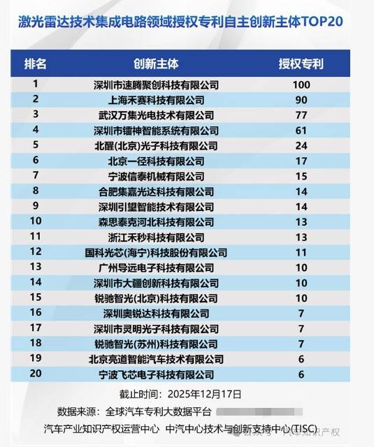 本榜单依托中汽信科自主开发的全球汽车专利大数据平台,对创新主体在激光雷达技术集成电路领域的授权有效专利进行统计分析,旨在通过专利数据的深度挖掘,全面呈现中国该领域的创新实力分布与竞争格局,为行业把握技术发展趋势、优化创新资源配置提供专业的决策参考。
