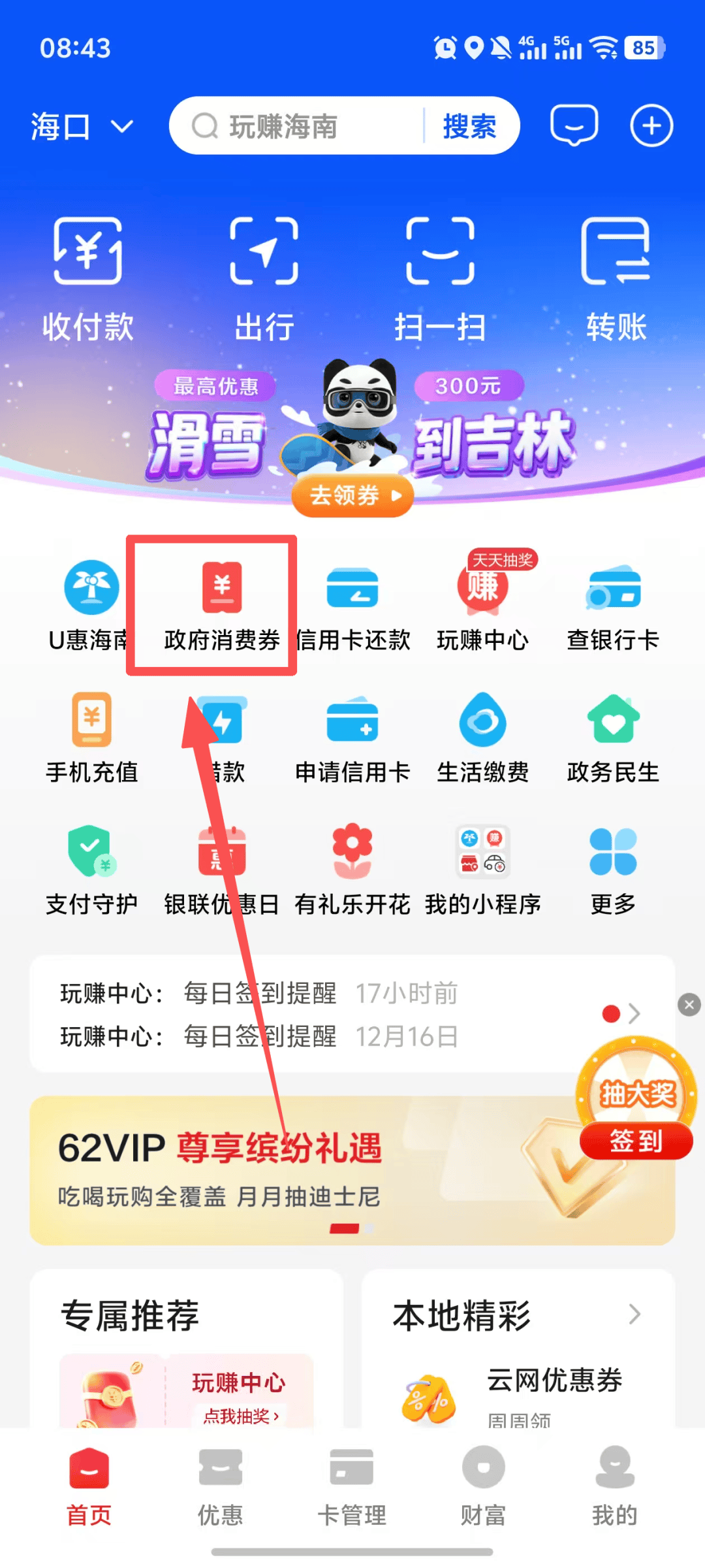 2.领券路径:云闪付APP首页“政府消费券—购在海南消费券”专区。