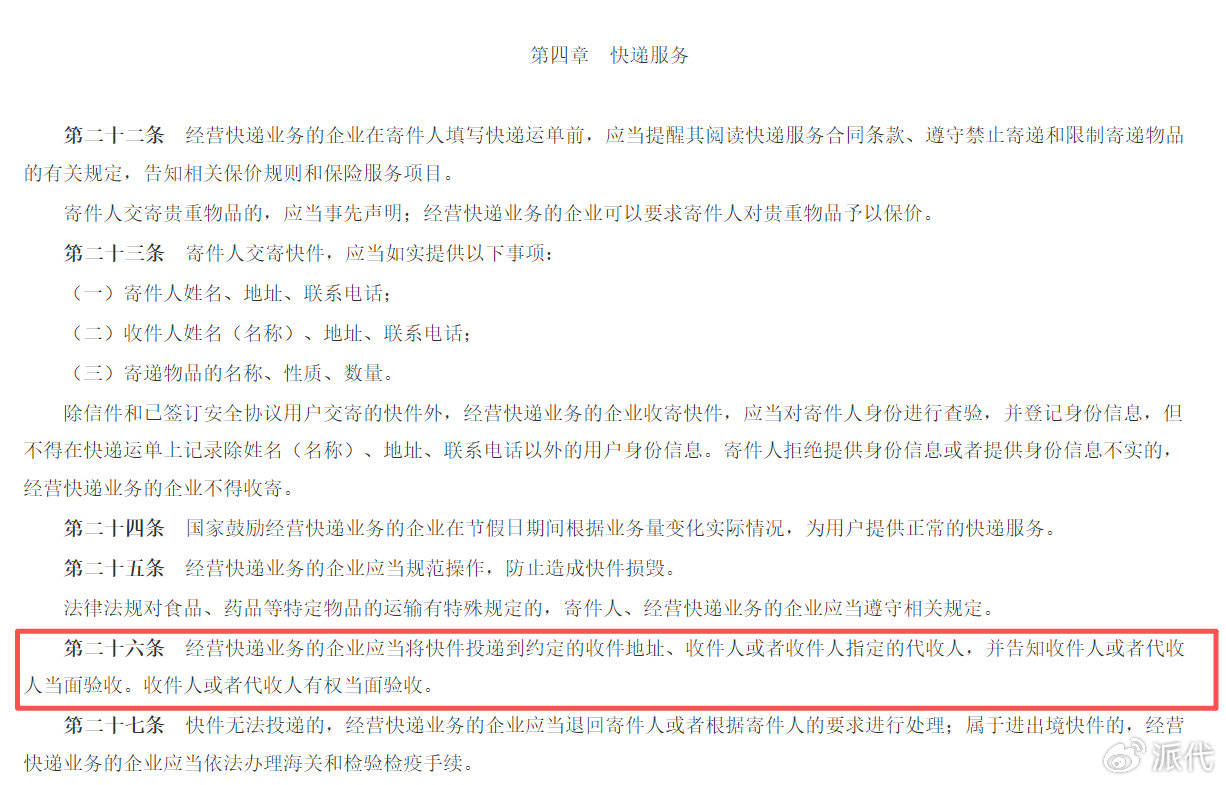 长期以来,消费者与快递配送之间的矛盾,主要集中在未经同意代收。用户明明在家,却收到一条取件码短信,被告知快递已放入丰巢或驿站。这种不告而投的行业惯性,不仅让老年人或行动不便者取件困难,也剥夺了消费者享受上门派件的权利。