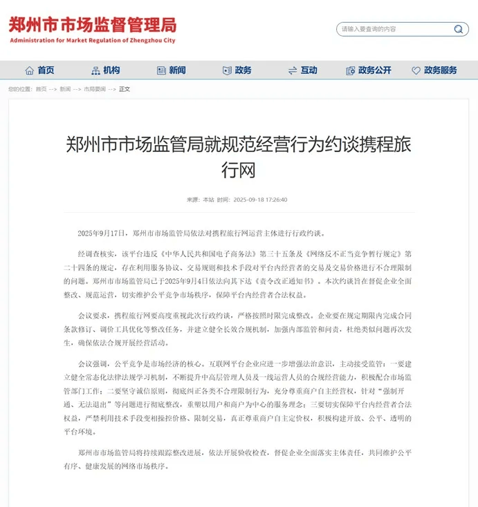 9月17日,郑州市市场监管局更是直接对携程下达《责令改正通知书》,查实其存在“利用服务协议、交易规则和技术手段对平台内经营者的交易及交易价格进行不合理限制”的违法行为,违反了《电子商务法》和《网络反不正当竞争暂行规定》。