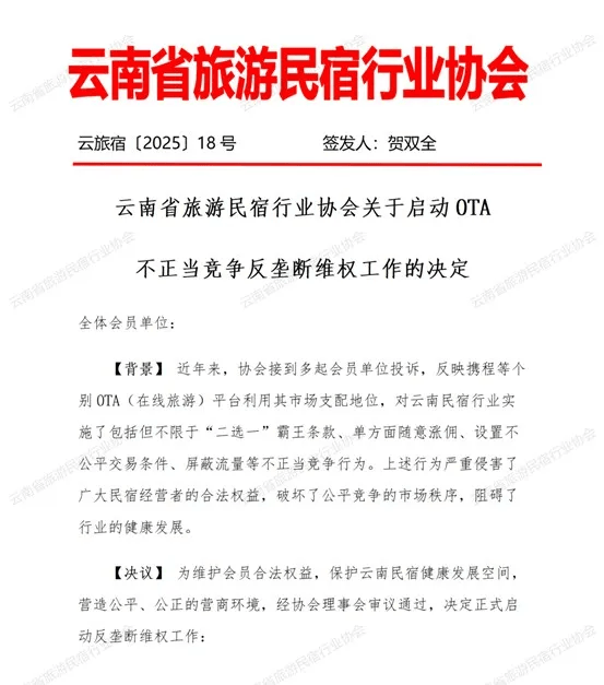 云南省旅游民宿行业协会一纸维权公告,正式对携程等在线旅游平台的垄断行为“宣战”,这场涉及7000家会员、直指“二选一”“随意涨佣”“屏蔽流量”的集体行动,不仅将平台与中小商家的矛盾推向舆论顶峰,更揭开了在线旅游行业长期存在的生态失衡伤疤。