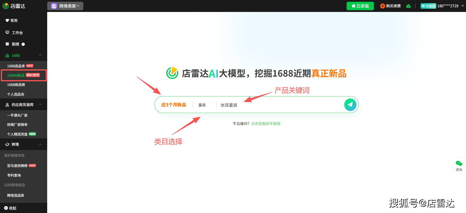 1、 首先我们打开店雷达选品工具,找到1688AI新品;