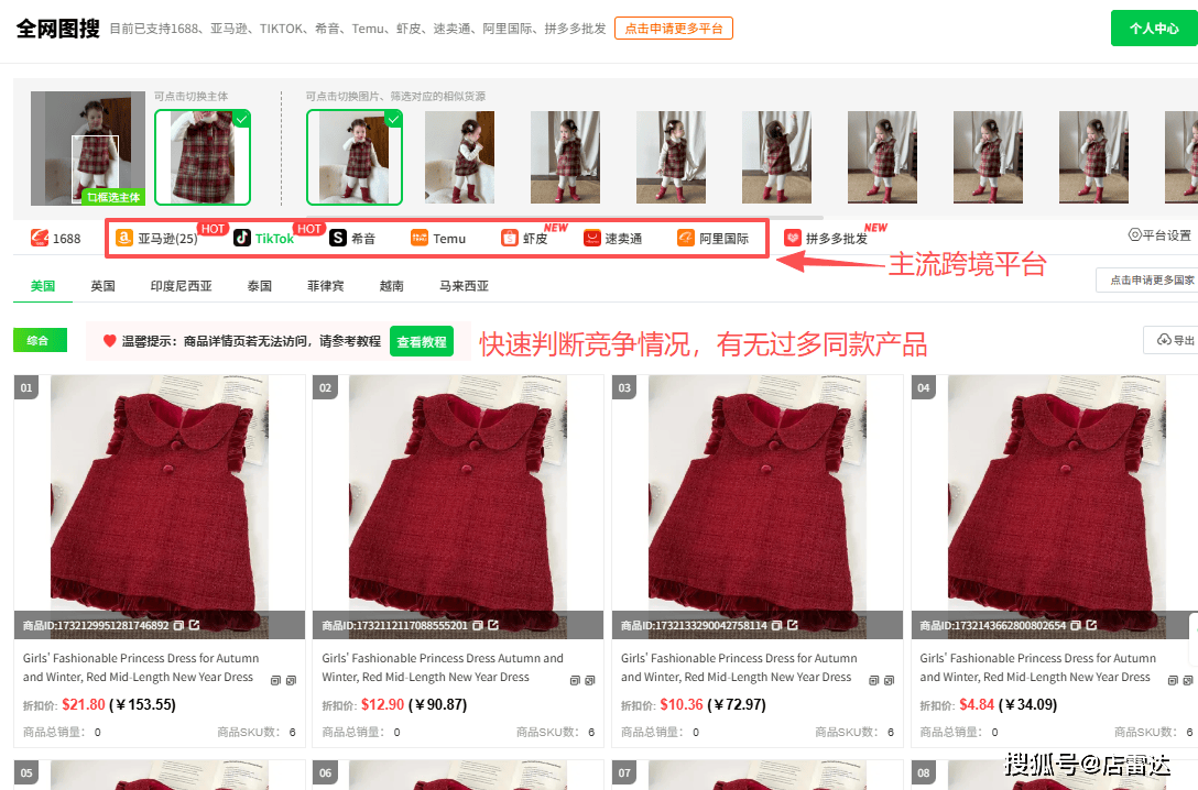4、 若是跨境卖家,可搭配全网图搜查看亚马逊、tiktok、temu、希音等主流跨境平台上的竞争情况,预估市场容量。