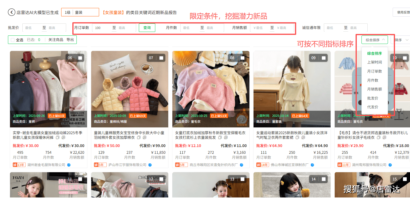 2、 选择目标类目,例如童装,或是直接输入产品关键词进行搜索,能够挖掘近3个月的真正新品;