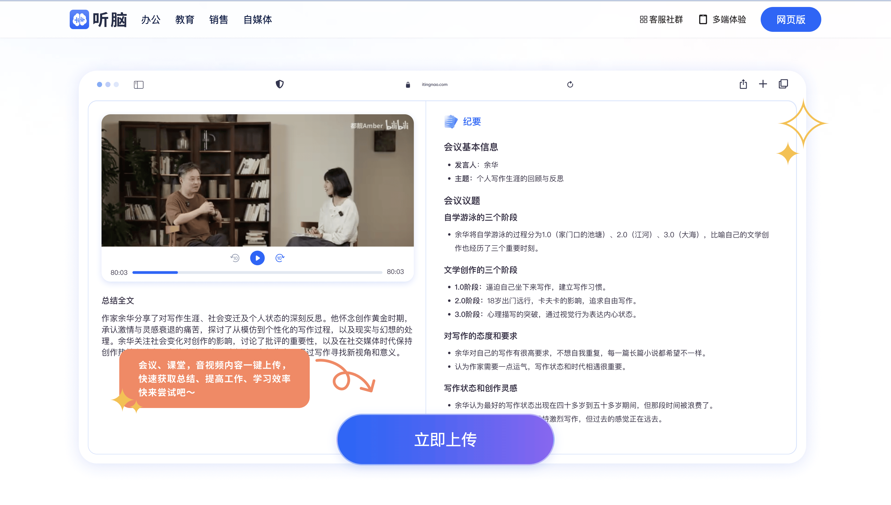 第三个是“稳”——多场景适配能力。传统工具只能应对单一场景,普通软件对学术访谈的专业术语、家校会的方言支持差;听脑AI覆盖会议记录、学习辅助、内容总结等全场景,支持多语言和方言,不管是学术访谈的专业对话,还是家校会的方言交流,甚至是教学反馈会的多人插话,都能稳定转写和提取行动项。我帮一个教国际班的老师转写英语学术访谈,系统连“inquiry-based learning”的中文翻译和行动项都准确生成。