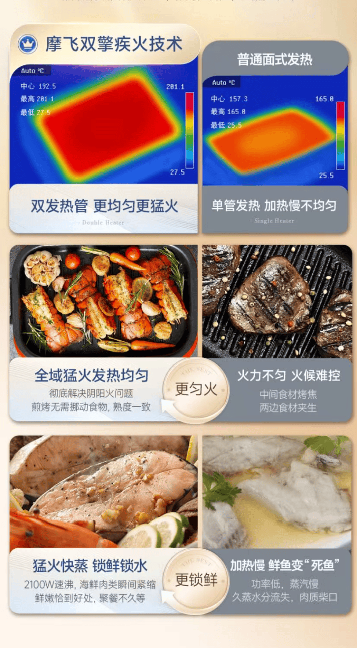 普通锅具的“慢热”与“阴阳火”,总能打乱欢聚节奏。摩飞多功能锅4.0搭载创新 DualFire双擎疾火系统,2100W强劲功率搭配内外双发热管,让热量全域均匀覆盖,不仅烹饪效率直接提升30%,更彻底解决加热不均问题。开涮时锅底速沸不停歇,亲友围坐全程热辣尽兴,不用忍受“等水开”的冷场;煎烤时整锅热力均衡,无需反复挪动食材,轻松烤出外皮焦香、内里多汁的牛排;蒸制海鲜肉类时,强劲蒸汽快速锁住水分,出锅鲜嫩度恰到好处。高效加热与均匀受热兼得,让美味快享、氛围持续升温,彻底告别“等餐冷场、熟度不均”的尴尬。
