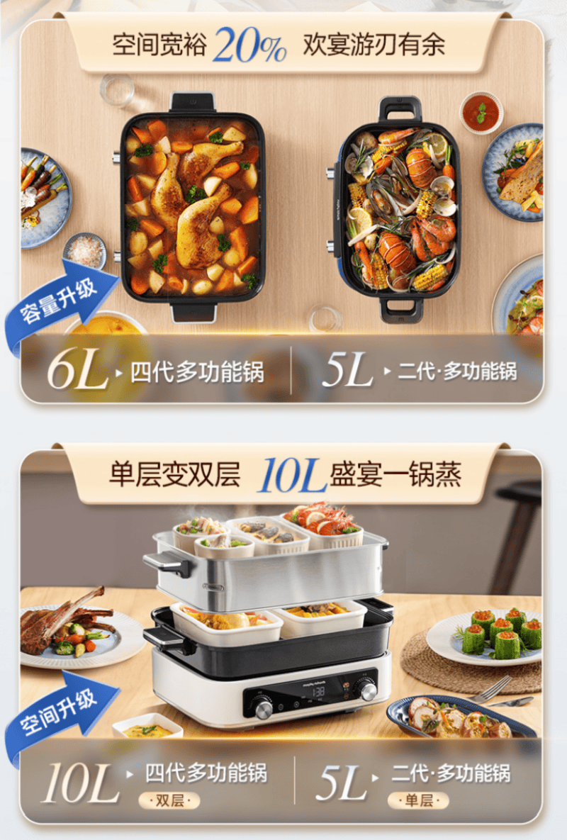 摩飞多功能锅4.0将深煮锅容量拓容20%至6L,整只慢炖鸡、满锅沸腾的火锅都能一次性容纳,好友小聚无需频繁起身忙活;叠加蒸格后瞬间拓展至10L大容量,周末家庭宴时,上层蒸着鲜嫩鱼虾、下层营养靓汤,双份美味同步出锅, 满足家人美食需求。无论是亲友聚餐还是节日家宴,都能稳稳撑住场面,让欢宴时刻游刃有余。