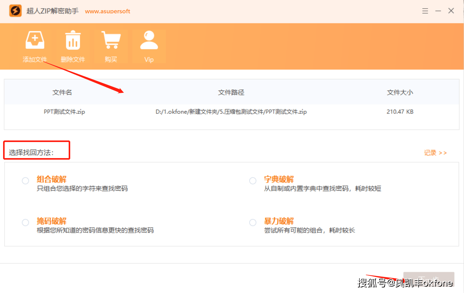 如果在进行分卷压缩时设置了加密,我们需要输入密码之后才能够进行方法一的操作,并且分卷压缩包合并之后,加密密码仍然存在,如果忘记了密码,我们需要先将zip分卷压缩包合并为一个,然后借助工具帮助找回压缩包密码,才能够解压文件了,比如超人ZIP密码解除助手,提供了四种方法,帮助我们找回zip压缩包密码。如果还记得一些密码信息,可以使用组合破解或者掩码破解