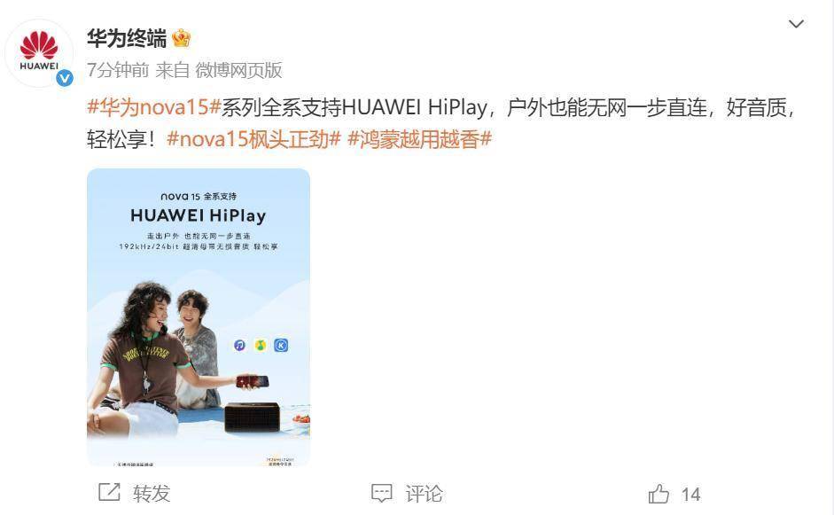官方微博华为终端宣布,nova15系列全系支持HUAWEI HiPlay功能,打破无线🛜音质瓶颈,让好音乐随时相伴。