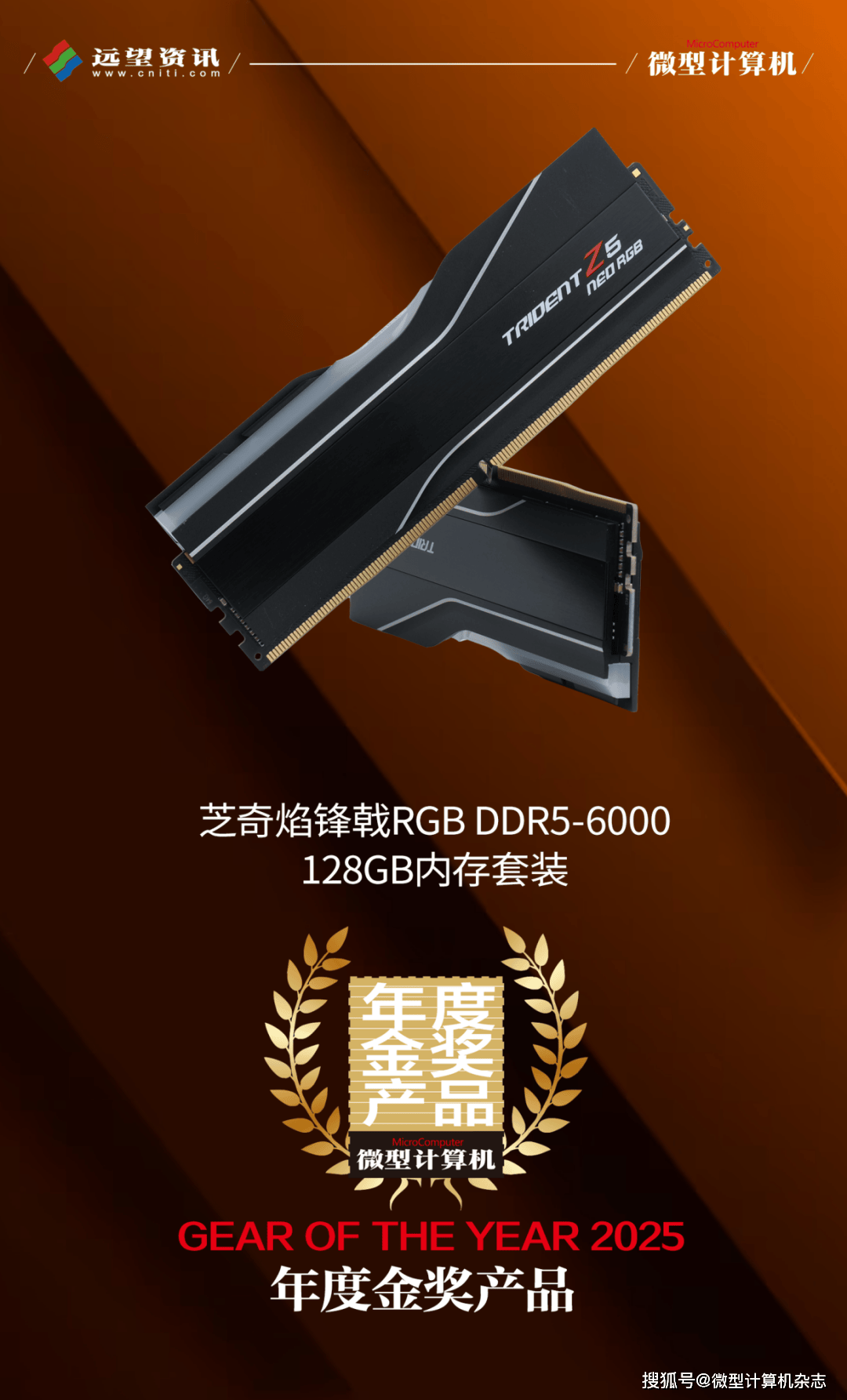 在这其中,来自芝奇的焰锋戟RGB DDR5-6000 128GB内存套装凭借超大的容量,优秀的AI应用与内容创作性能,以及可以超频到DDR5 7200的能力与惊艳的RGB灯效,在容量、性能、颜值上都有完美表现,多年本次评选的最高奖项——年度金奖。