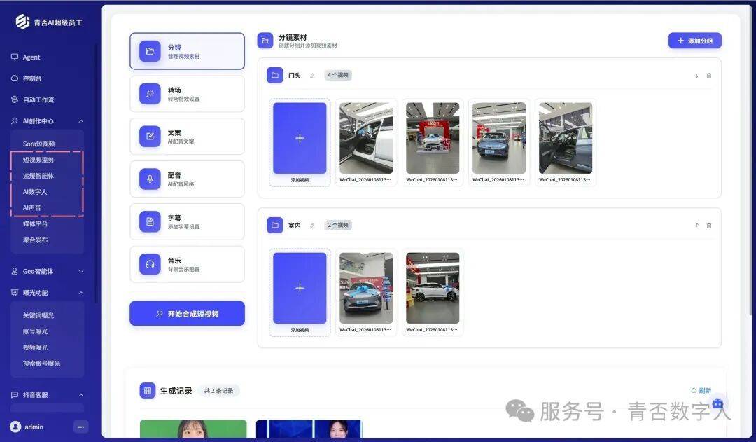 视频素材分组管理:按镜头、场景自定义上传并归类素材,建立专属视频库。