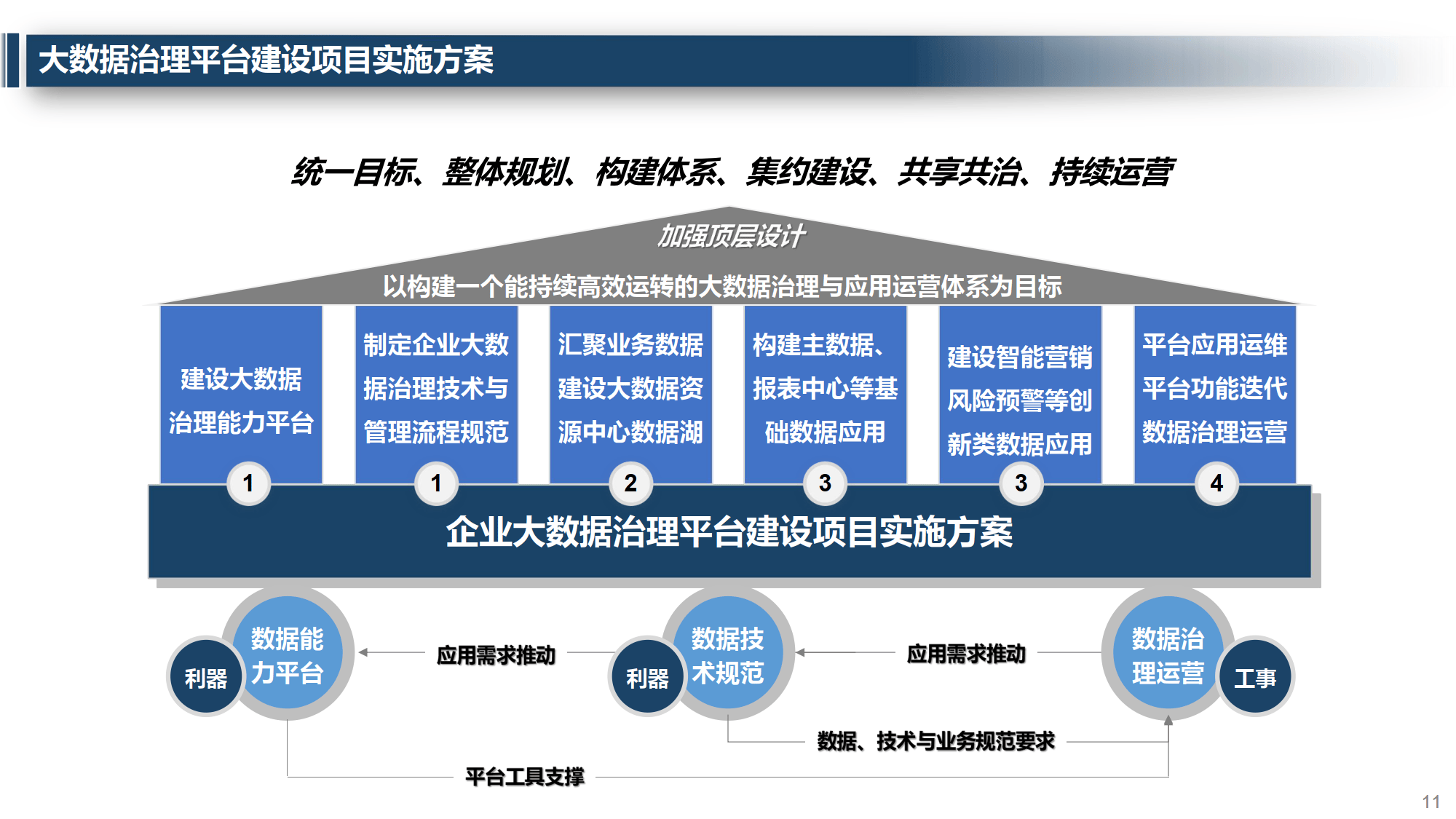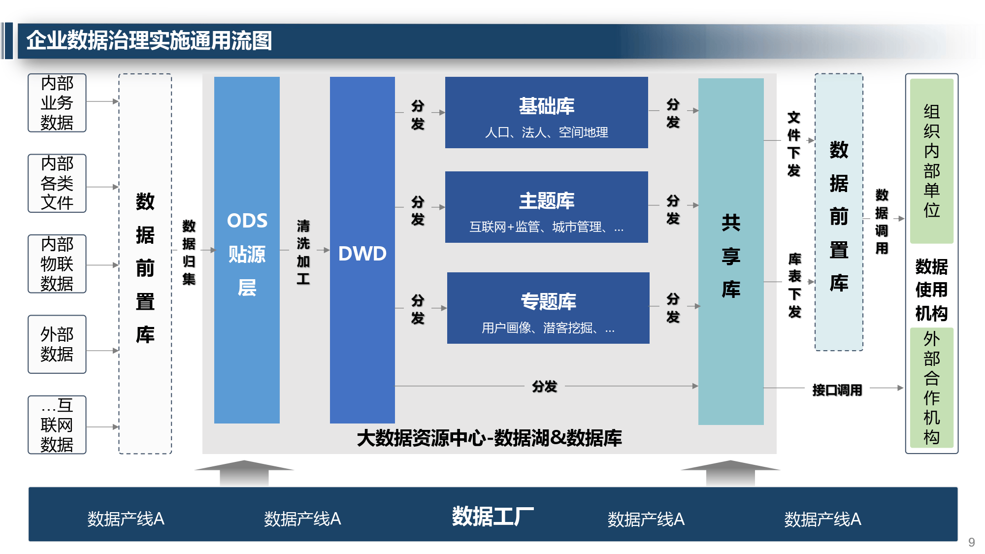 遵循 “加强顶层设计 — 制定规范 — 建设资源中心与基础应用 — 开发创新应用 — 平台运维与运营” 的实施路径,数据经前置库、贴源层、主题库等层级加工,最终形成数据产品服务各类应用场景。