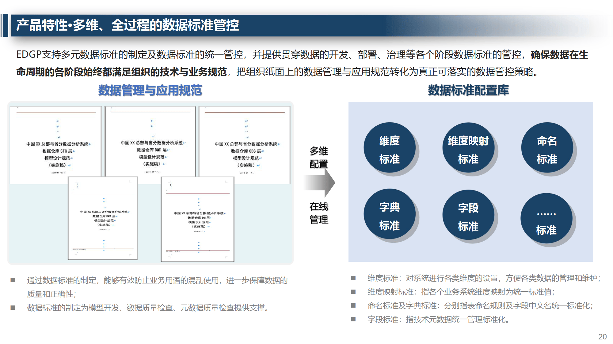 包括元数据管理(自动采集、血缘分析等)、数据标准管控(维度、命名等多类标准)、可视化数据产线开发、统一任务调度、全过程数据质量管控、规范的数据资产管理及严密的安全保障。同时具备数据目录管理、数据开发、统一监控运维等功能,实现数据全生命周期管控。