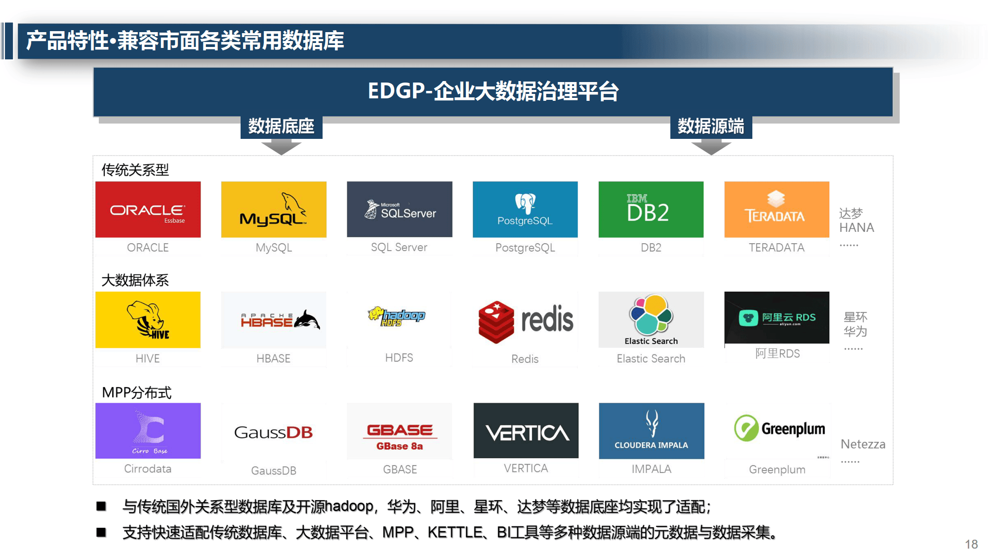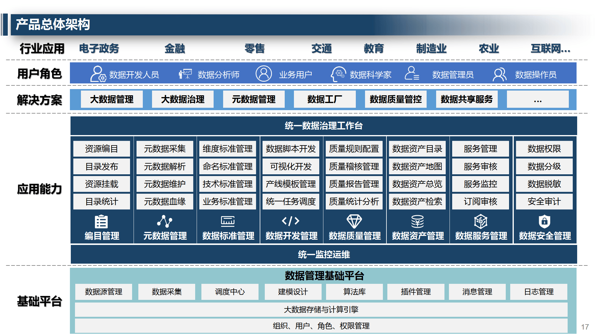 平台以元数据为核心驱动全链路治理,涵盖数据管理基础平台、大数据存储与计算引擎、统一数据治理工作台等层级,兼容 Oracle、MySQL 等市面各类常用数据库,支持多行业、多角色用户使用。