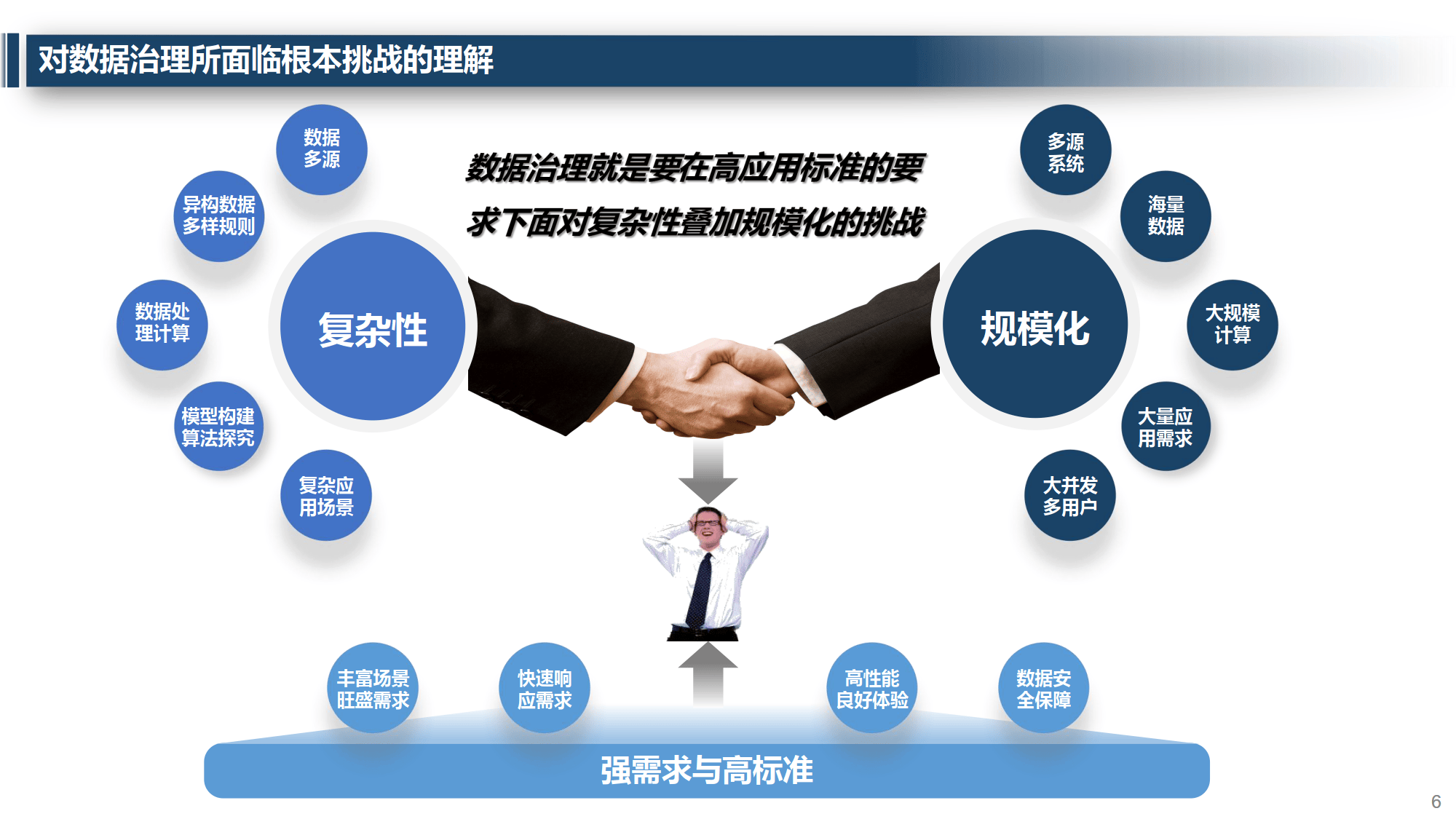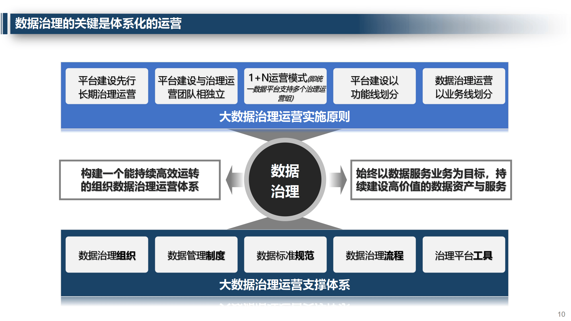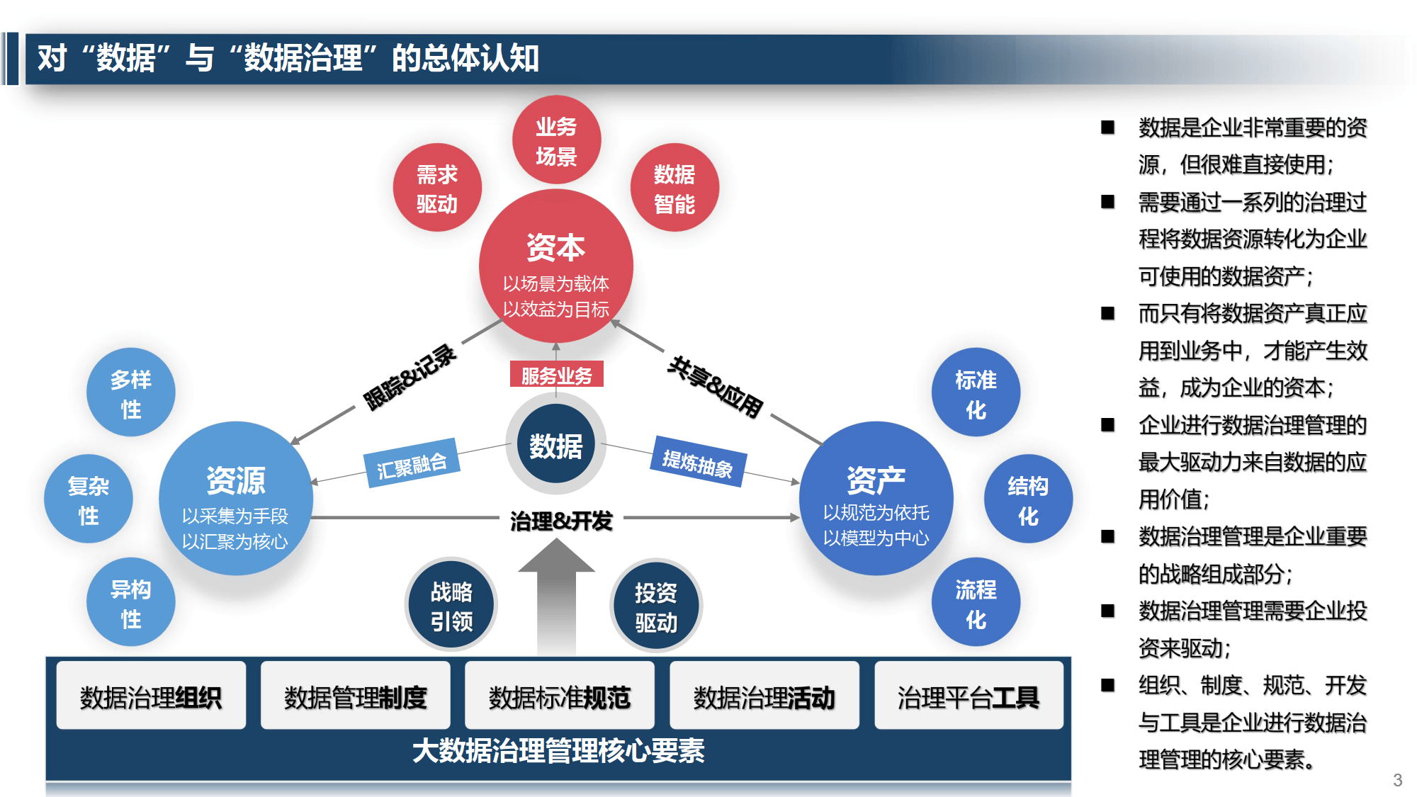 大数据治理以场景为载体、效益为目标,依托规范、采集手段,围绕模型与汇聚核心,旨在沉淀数据资源、开发数据资产、构建数据服务,最终兑现数据价值、驱动业务增长。其核心是构建 “三资模型” 完整体系,涵盖战略愿景、管理机构与制度、数据标准规范等要素,需实现数据处理工厂化、模型标准化、治理产品化、运营全员化与安全可控化。