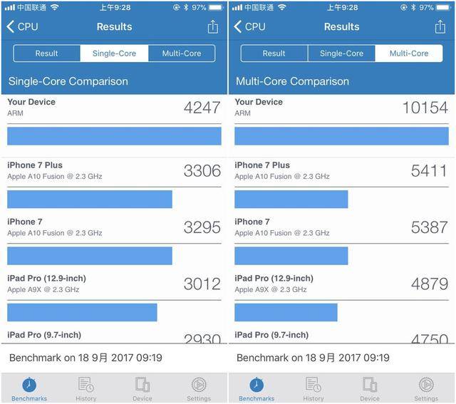 这样的成绩可以说是吊打了自家的 A10 Fusion 处理器,iPhone 7 Plus 上那颗 A10 Fusion 单核典型成绩是 3306,差距不大,多核典型成绩是 5411。这次 A11 Bionic 因为采用了 6 核心(2 高性能核心,4 高能效核心)的设计,所以这次 A11 Bionic 多核性能暴涨,差不多是 A10 Fusion 的两倍了。