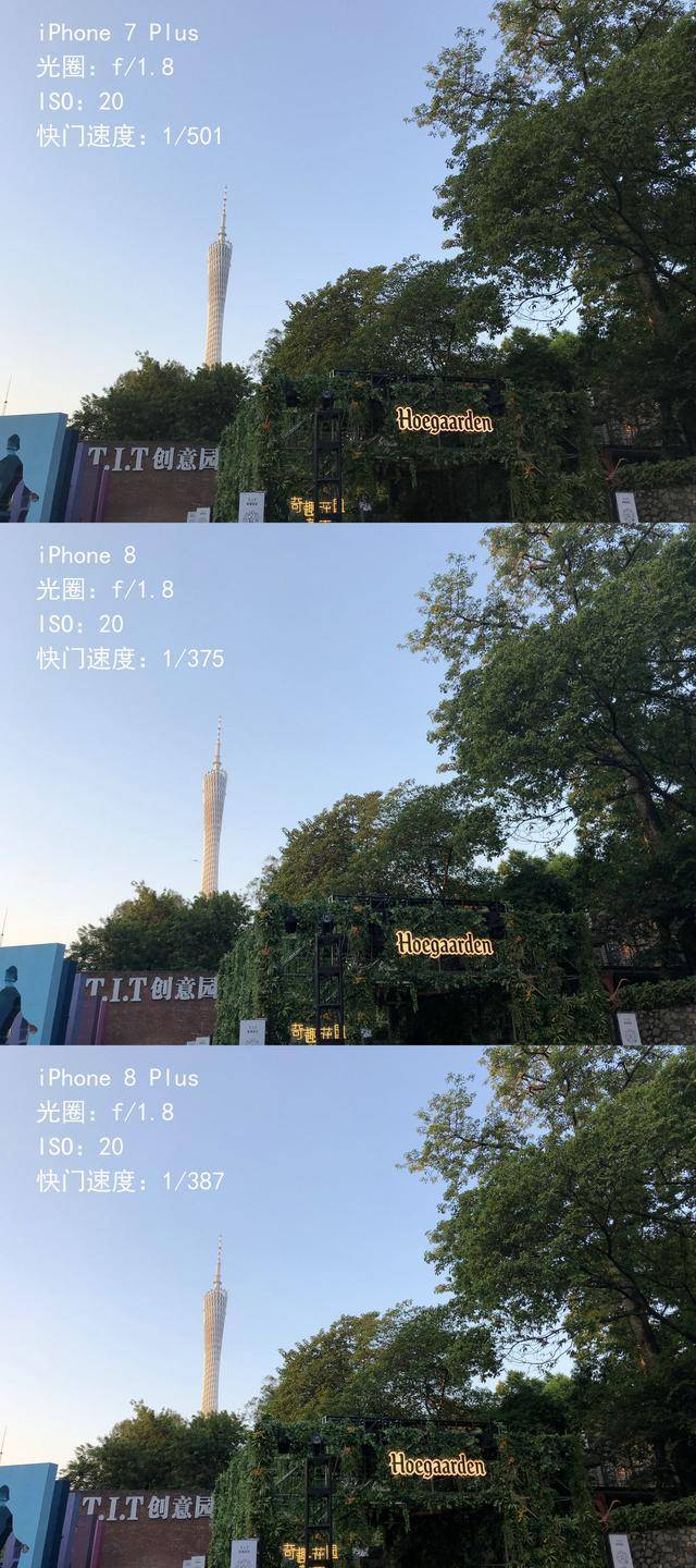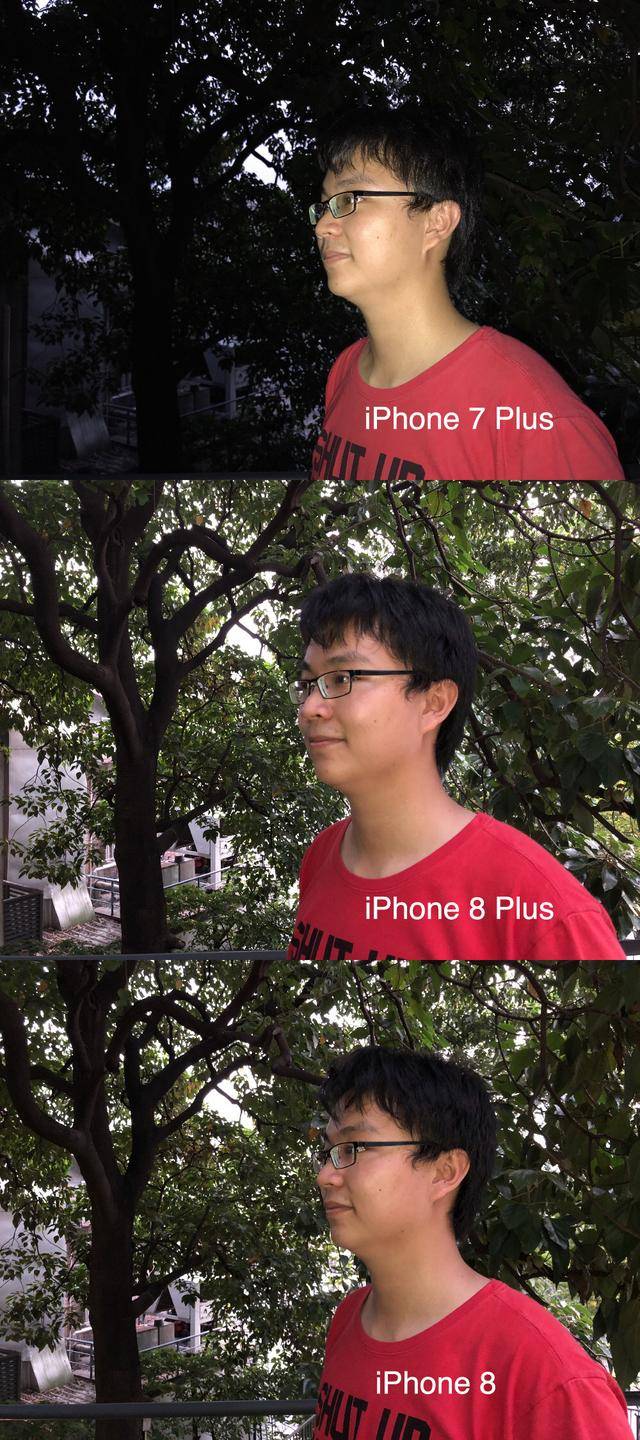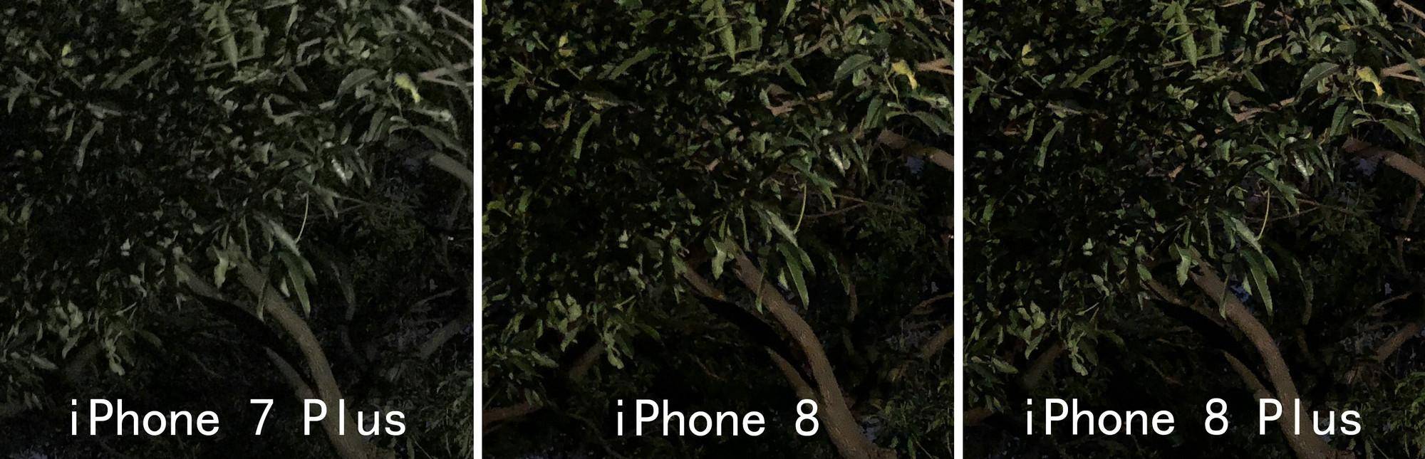第一组样片统一使用 28mm 的广角镜头拍摄。相比 iPhone 7 Plus,iPhone 8 系列在解析力上其实没有什么提升,唯一的区别在画面暗处——树叶保留了更多细节,而 iPhone 7 Plus 只能看到树叶轮廓。至于 iPhone 8 和 iPhone 8 Plus 之间,几乎没有区别。