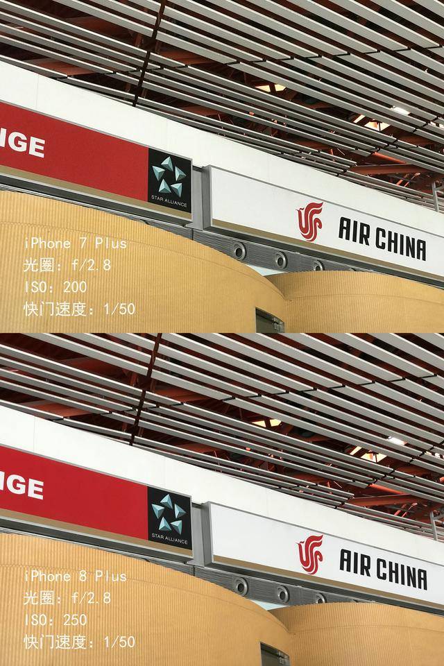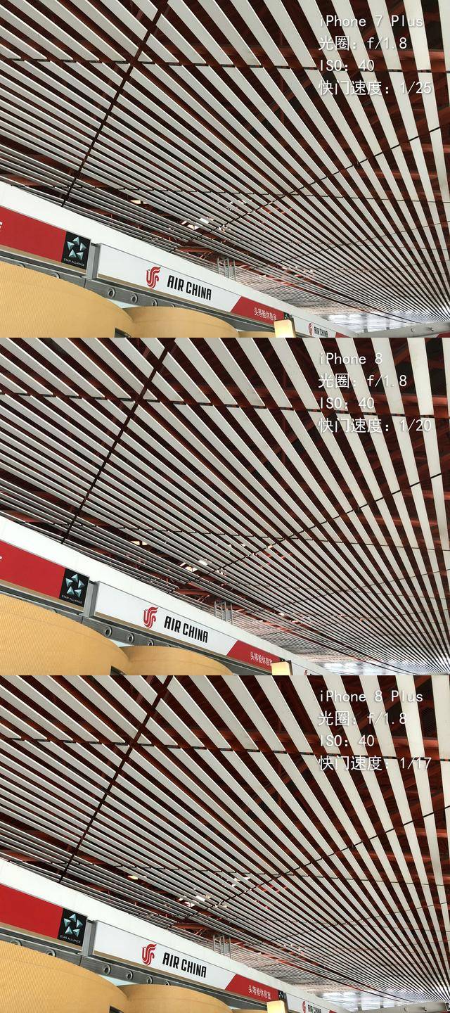 第二组样片重点测试解析力,观察装潢的纹理处,iPhone 7 Plus、iPhone 8 和 iPhone 8 Plus 几乎保持了相同的成像水准,不过放大照片发现,iPhone 8 双机的噪点比 iPhone 7 Plus 少了不少。
