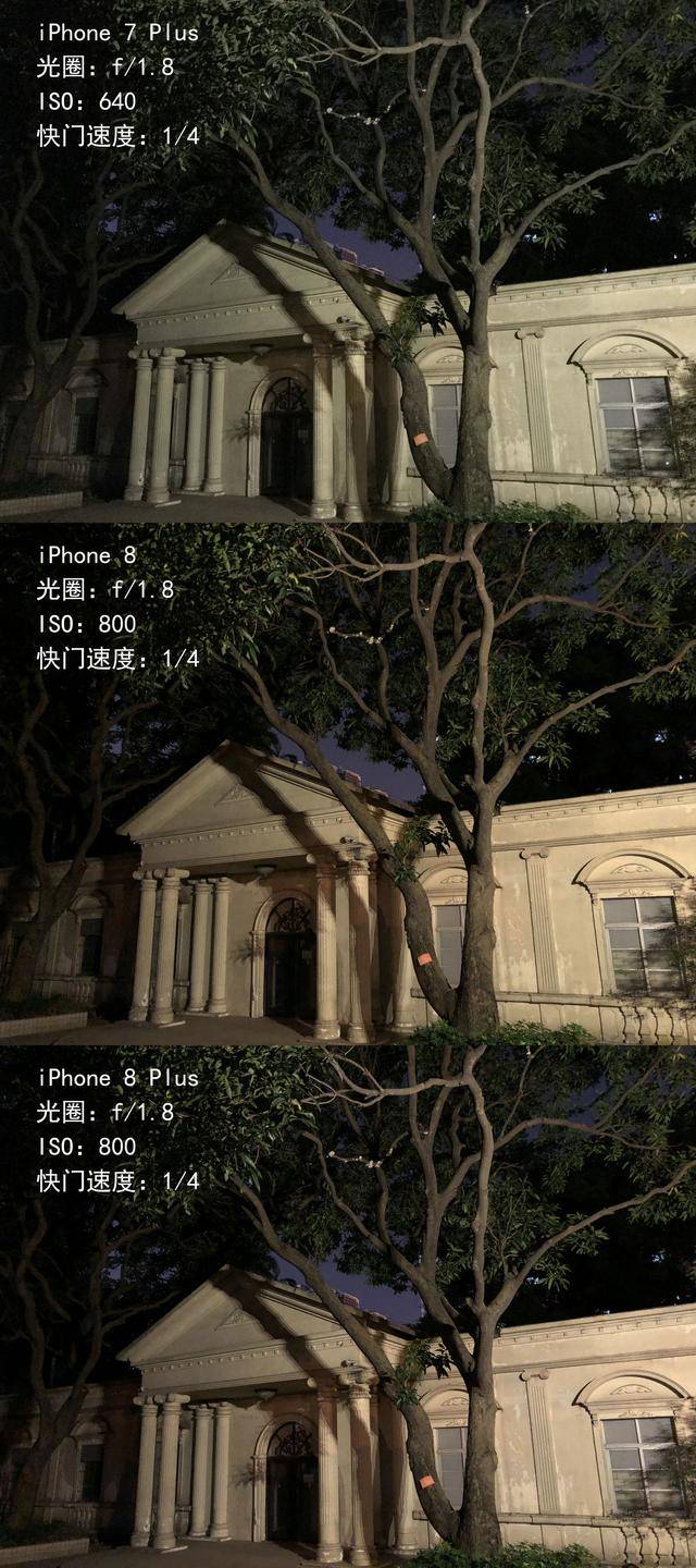 在夜拍的对比中,iPhone 8 双机显示出不少优势,在呈现建筑细节和枝叶上,iPhone 8 系列的画面更锐利,噪点更少。