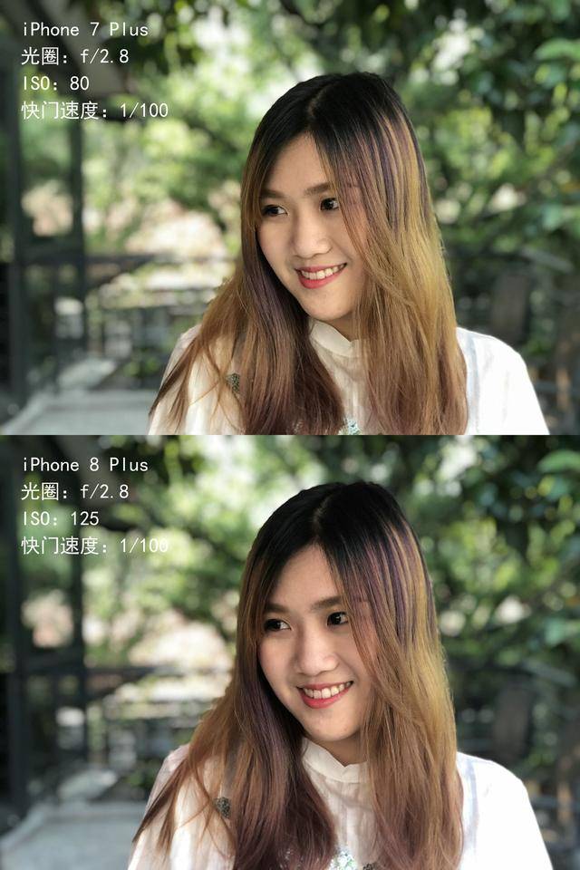在下面这组暗光人像模式对比中,iPhone 8 Plus 的成像质量明显好过 iPhone 7 Plus,噪点明显更少,细节更丰富,也没有出现 iPhone 7 Plus 局部过曝的情况。