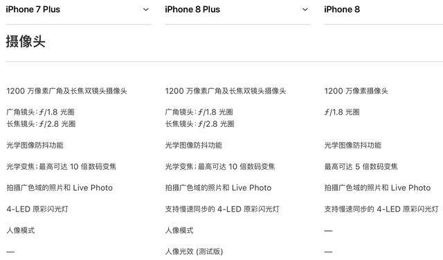 从苹果官网提供的摄像头参数看,iPhone 8 系列与 iPhone 7 系列变化不大:依然是凸起的摄像头,iPhone 8 依然配备的是一颗 f/1.8 光圈的 1200 万像素摄像头,iPhone 8 Plus 则还有 f/1.8 的广角镜头+f/2.8 的长焦镜头的双摄组合,能提供两倍画质无损的光学变焦。