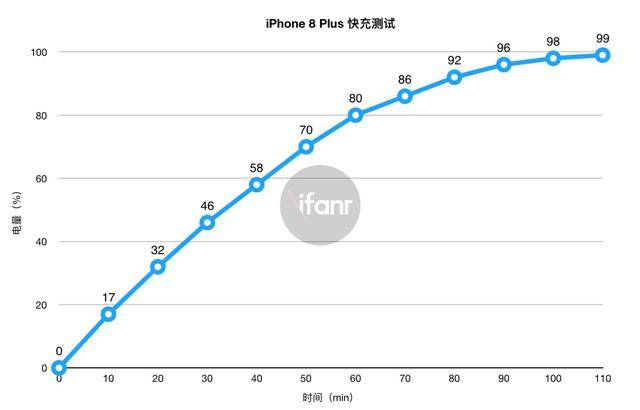 以上就是 iPhone 8 Plus 搭配官方 29W 充电器的充电效果。爱范儿(ifanr)从手机电量完全耗尽关机状态下开始充电,实测半小时充到 46%,和苹果宣称“半小时最大可充至 50%”差距不大,一小时则可以充到 80%,而在一小时后的充电效率明显下降。从 iPhone 8 Plus 的充电效率上来看,明显是没有用到 29W 充电器的全部效能,充电速度和主流的国产 Android 旗舰手机快充略微有些差距。半小时 50% 左右,一小时 80% 的充电速度勉强能让人满意。
