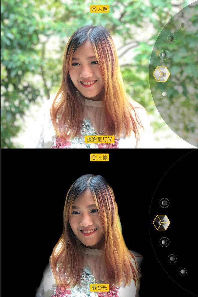 作为“人像模式”下的细分功能,iPhone 8 Plus 提供了“自然光、摄影室灯光、轮廓光、舞台光、单色舞台光”五种模式,你可以直接实时以不同模式拍摄,也可以像添加滤镜一样进行后期调整。