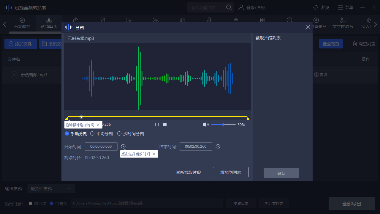 操作体验:打开软件选择“音频剪辑”功能,导入文件,通过拖动进度条上的滑块就能确定剪切范围,支持“平均分割”和“时间分割”,导出速度非常快。
