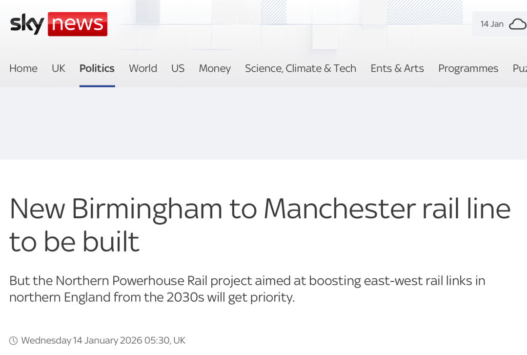 1月14日,英国工党政府宣布将在伯明翰和曼彻斯特之间修建一条新的铁路线。然而,工党政府并没有提供任何关于铁路建造的时间表以及工程融资等任何规划细节。