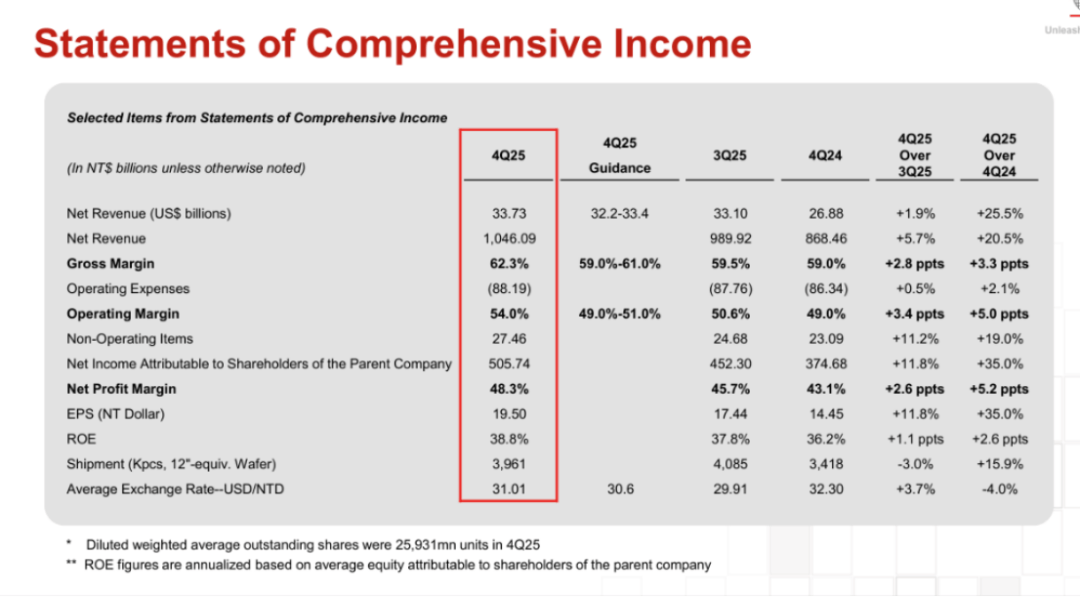 2025 年 Q4,台积电营收 336.7 亿美元💵(10460.9 亿新台币),同比增长 25.5%,环比增长 5.7%。净利润 5057.4 亿新台币,同比暴增 35%,这是台积电连续第八个季度实现利润同比增长。净利率达 48.3%,毛利率 62.3%。