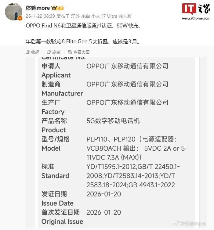 结合 此前报道,型号为 PLP110 和 PLP120 的 OPPO 新机已通过 3C 认证,博主 @体验more 认为这两款手机是 Find N6 和卫星通信版,支持 80W 快充,是年后第一款『骁龙』 8 Elite Gen 5 大折叠,应该是 3 月发布。