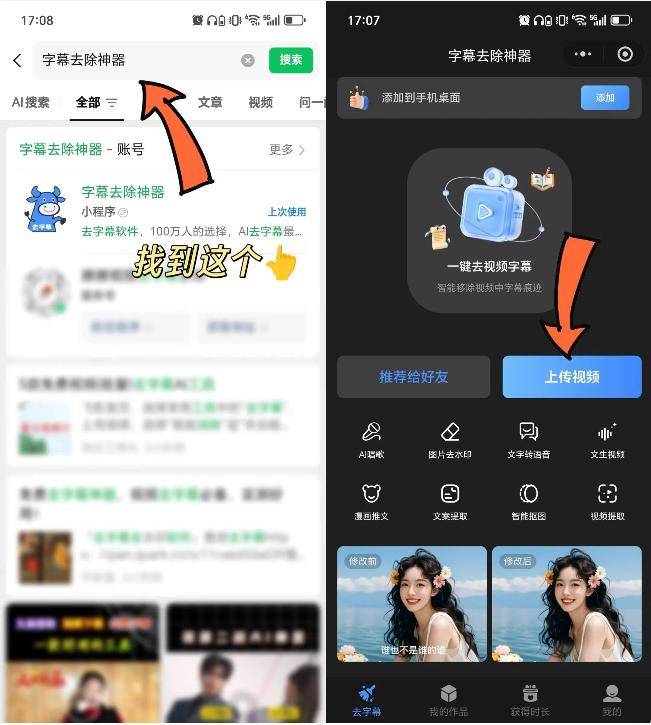 - 微信搜「字幕去除神器」,上传待处理视频;