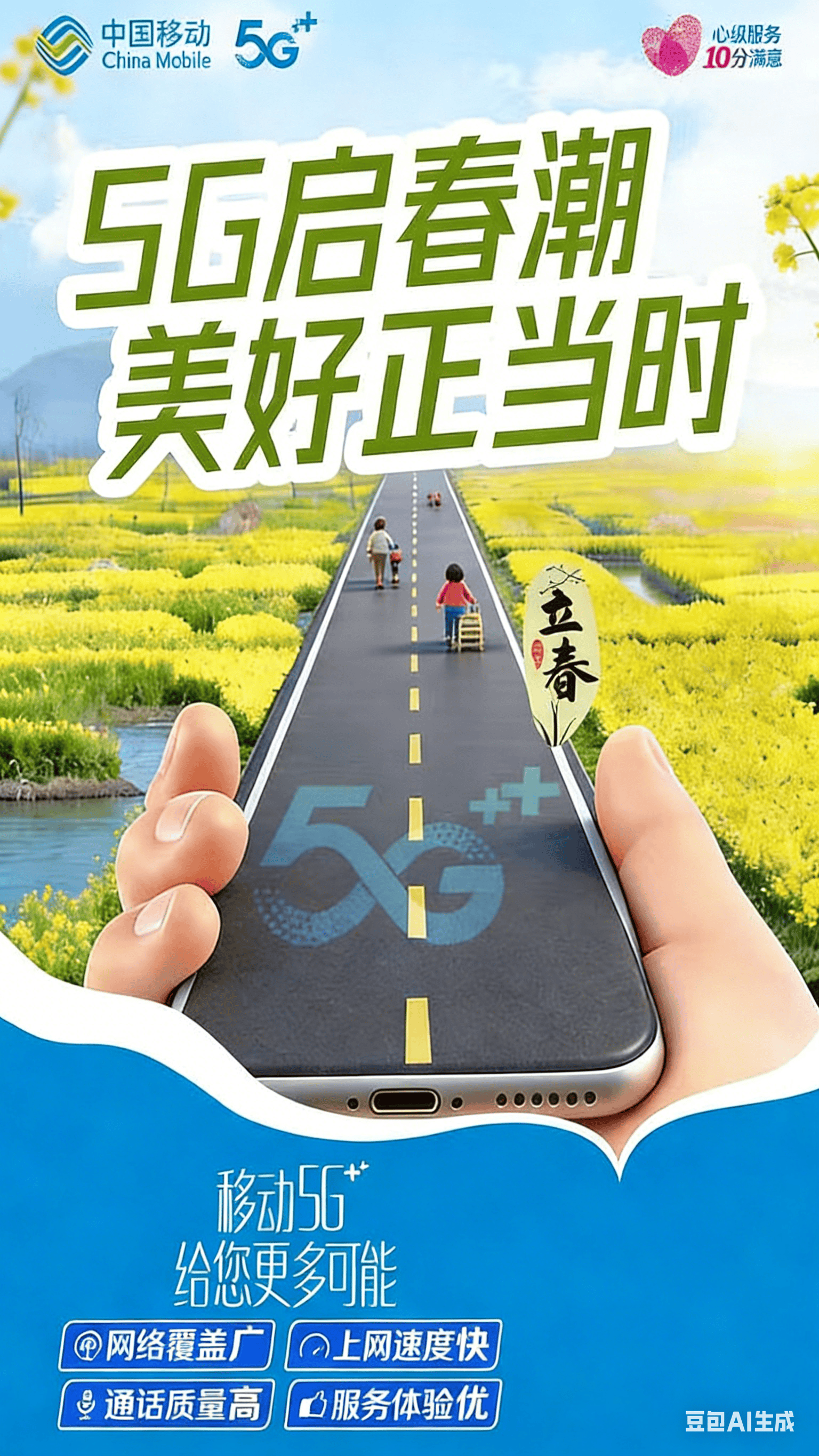 春运路上,5G 网络覆盖广、速度快,让你在拥挤的车厢里也能清晰视频报平安,和家人分享沿途的春光;居家团聚时,5G 信号稳如磐石,全家围坐刷春晚、云拜年、看大片,流畅不卡顿,让每一份思念都能即时抵达。