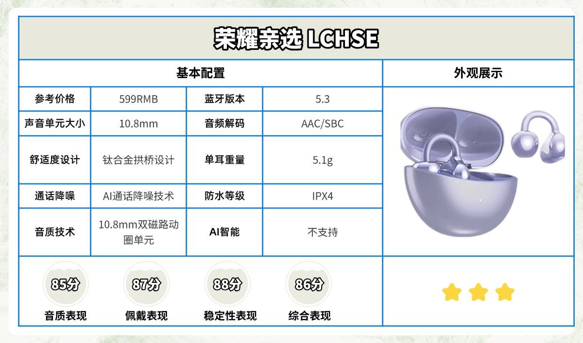荣耀LCHSE耳机巧妙融入中式拱桥设计元素,并采用钛合金等多样材质,在科技质感中自然流露东方美学韵味。外壳以钛合金结合耐磨PC复合制成,既保持轻盈也兼顾耐用,单耳重量仅为5.1克。